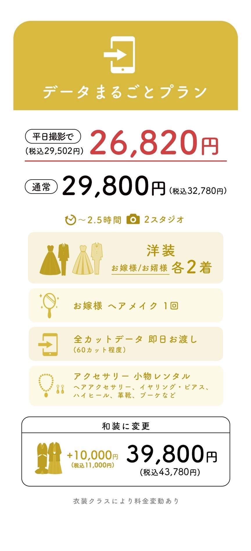おふたりの衣装各2着や、全カットデータ(60カット程度)のお渡しなどが含まれているこちらのプランは