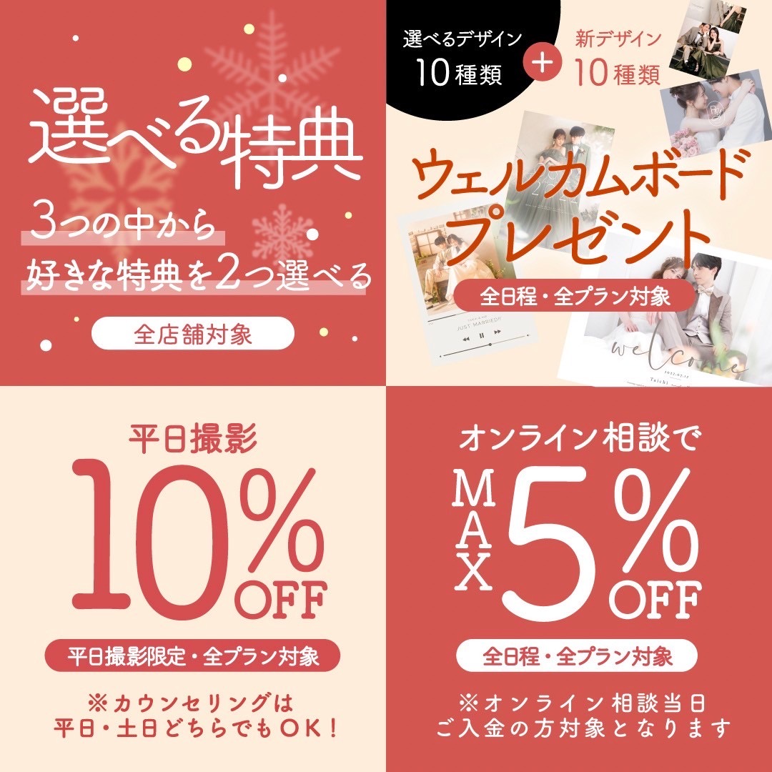 12月中のご契約&2月末までのご撮影実施の方を対象として、3つの中から2つ選べる特典をご用意!
