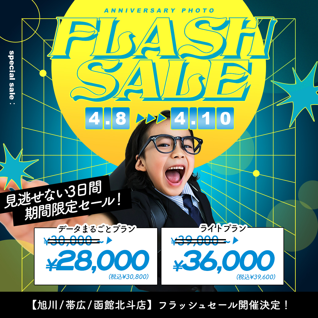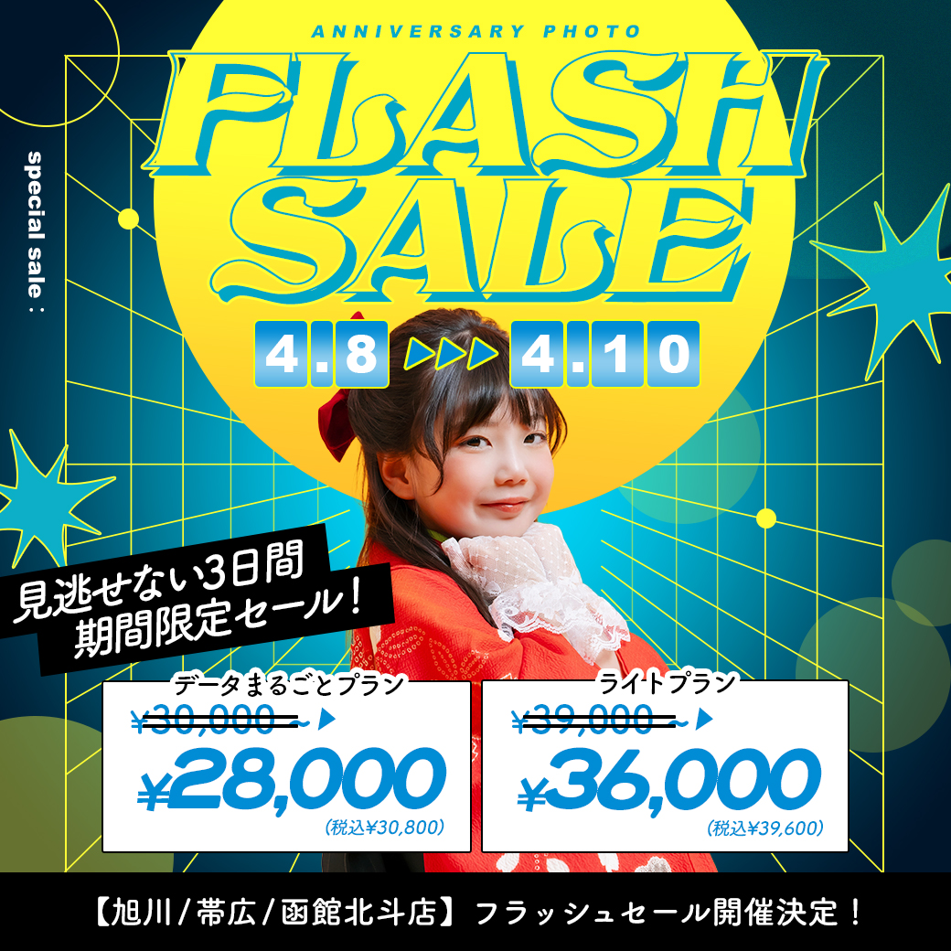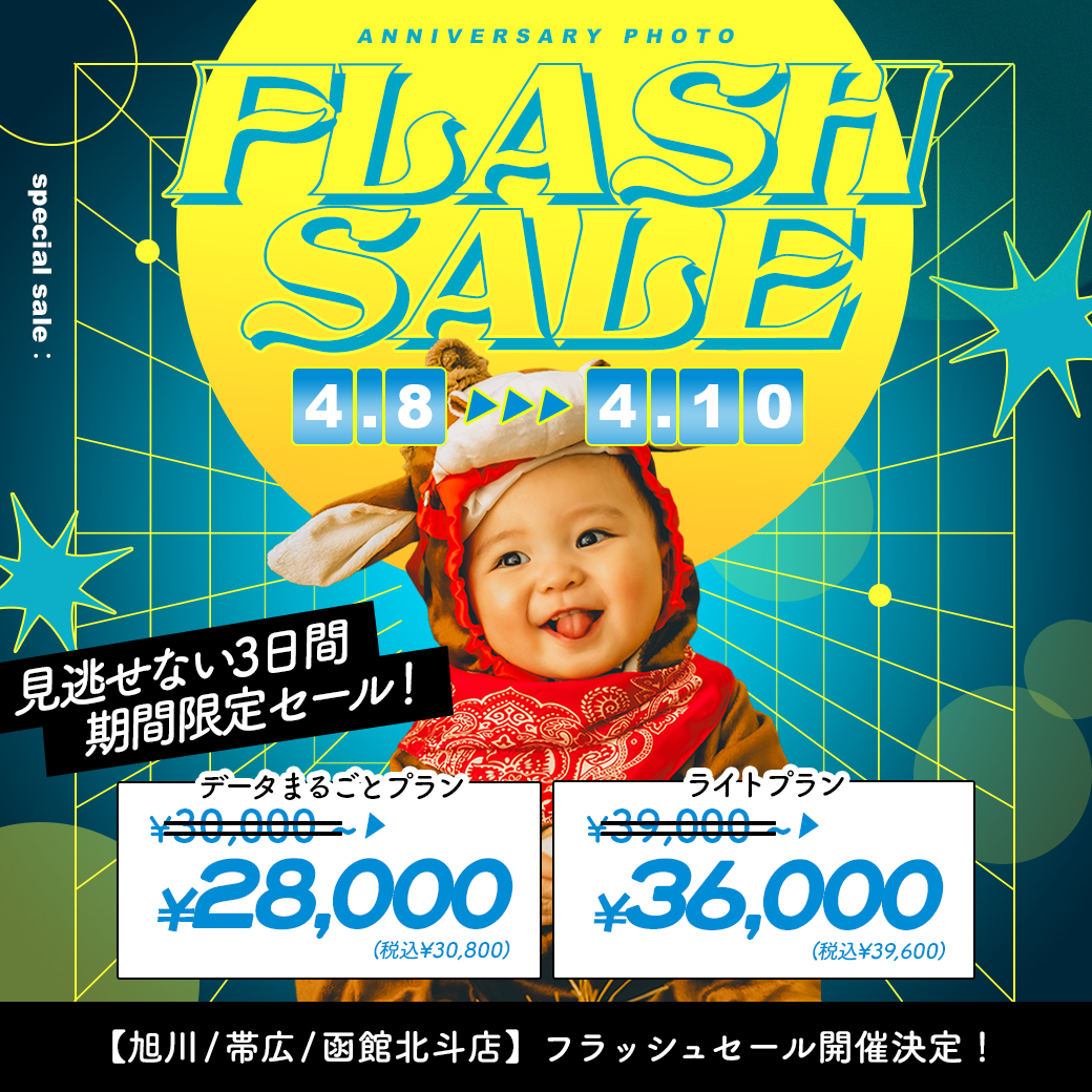 電撃プライス!”フラッシュセール”開催【4/8〜4/10】 / ベビーキッズ全種目記念撮影対象!【旭川店 / 帯広店 / 函館北斗店】