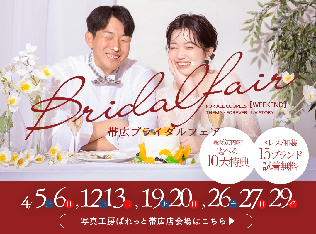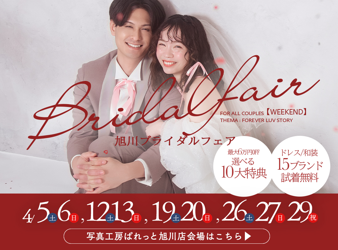 【12月フォトウェディングキャンペーン】 年内の営業日:12月30日(火)まで営業いたします。 ※ブライダルフェア特典とは併用不可 ※札幌ブライダルフェアと12月キャンペーンとの併用はできません。予めご了承くださいませ。 「色々含めると結局いくら?」「今の時期はどのロケ地がおすすめ?」気軽に質問OK! 【ロケをご検討の方】LINEで相談✅> ◆Event ★【サッポロファクトリー店】12月毎週末ブライダルフェア サッポロファクトリー店はこちら> ★【札幌中央店】12月毎週末ブライダルフェア 札幌中央店はこちら> ★【旭川店】12月毎週末ブライダルフェア 旭川店はこちら> ★【帯広店】12月毎週末ブライダルフェア 帯広店はこちら> ◆NEWS サッポロファクトリー店限定”挙式フォトウエディングプラン”感動のセレモニーとフォトをこの場所で。プラン価格¥10,800+税〜 サッポロファクトリー店限定”Premierアクセサリー”衣装と共に、トータルコーディネートをとことんこだわって。Premierアクセサリーがリリース! サッポロファクトリー店&札幌中央店限定”Premierタキシード”フォトウエディングはふたりが主役!お婿様に向けて高級&トレンドシリーズ”プレミアタキシード&袴”をリリース ウエディング公式LINEがオープン!最新情報や限定クーポンをいち早くGET ドレス・衣装ラインナップ”プレミアライン” ロケーションフォト限定の特大アルバム登場 ◆Flow ◆フォトウエディングプランはこちら ◆【全着掲載】衣装はこちら ◆お電話でのお問い合わせはこちらから サッポロファクトリー店 011-207-4466札幌中央店 011-596-8155旭川店 0166-73-8485帯広店 0155-67-8008 札幌・旭川・帯広でのフォトウエディングは写真工房ぱれっと/TOPページはこちら▶︎ ¥29,800〜(税込¥32,780〜) 詳しく見る ¥39,800〜(税込¥43,780〜) 詳しく見る ¥128,000〜(税込¥140,800〜) 詳しく見る ¥39,800〜(税込¥43,780〜) 詳しく見る ¥19,800〜(税込¥21,780〜) 詳しく見る