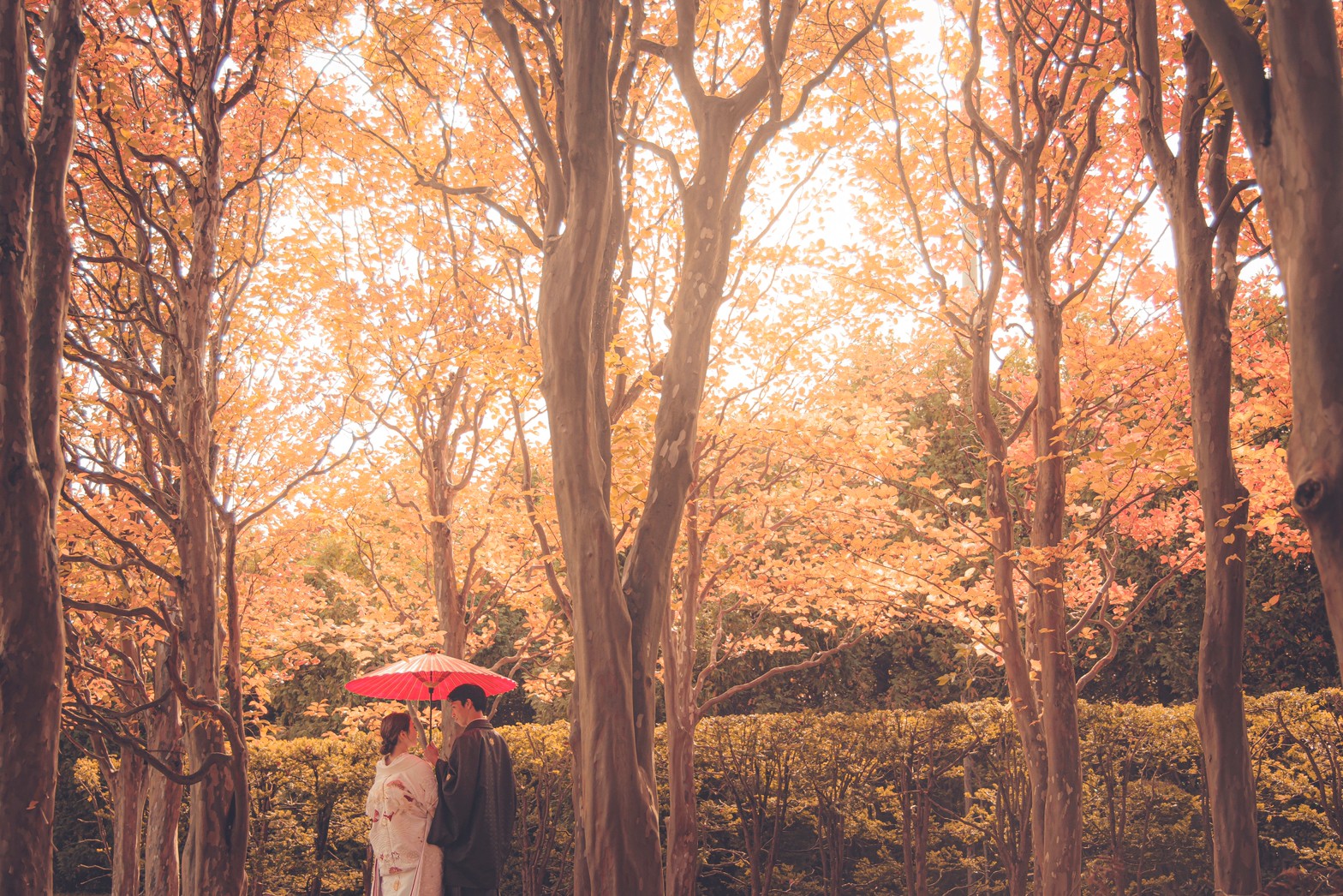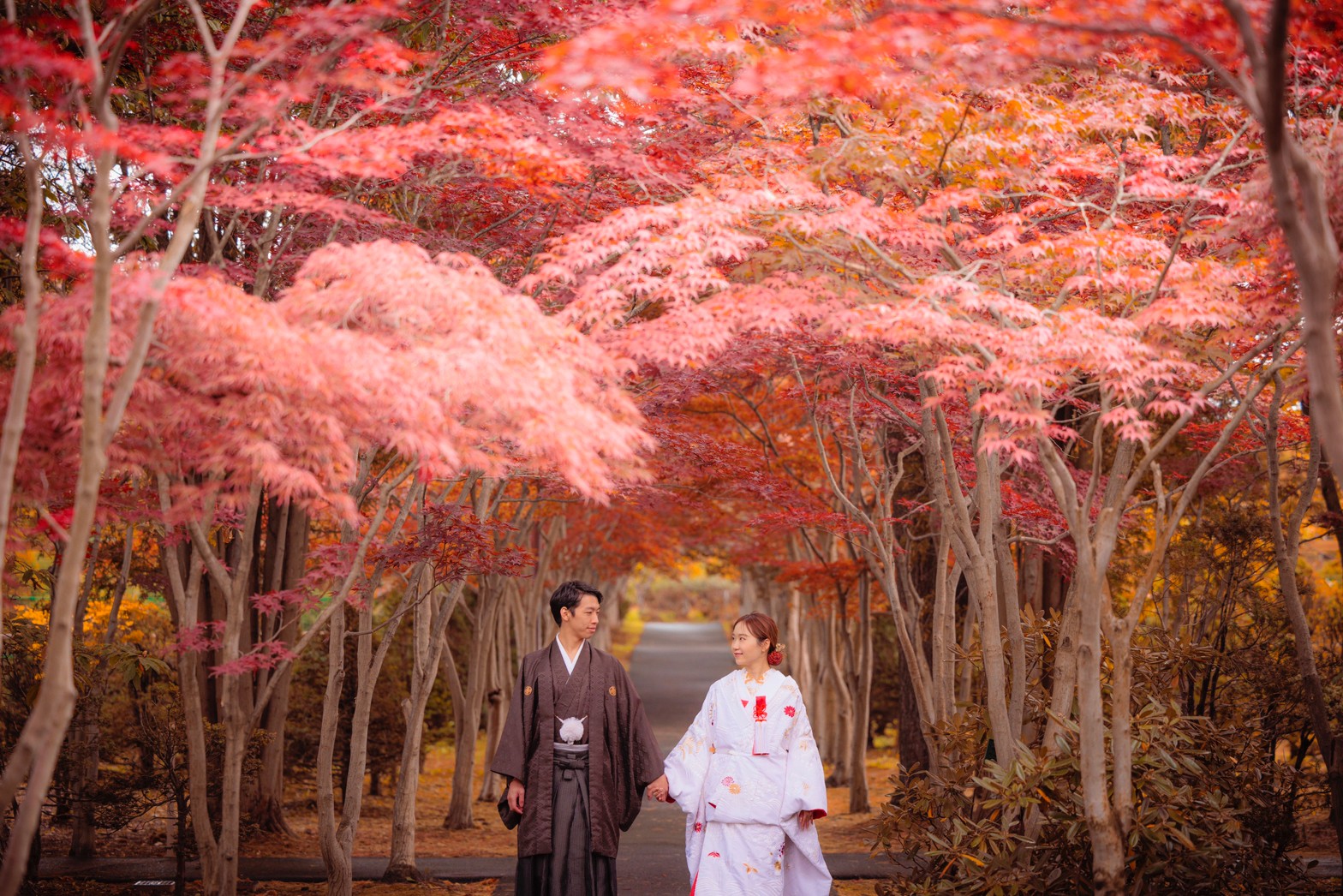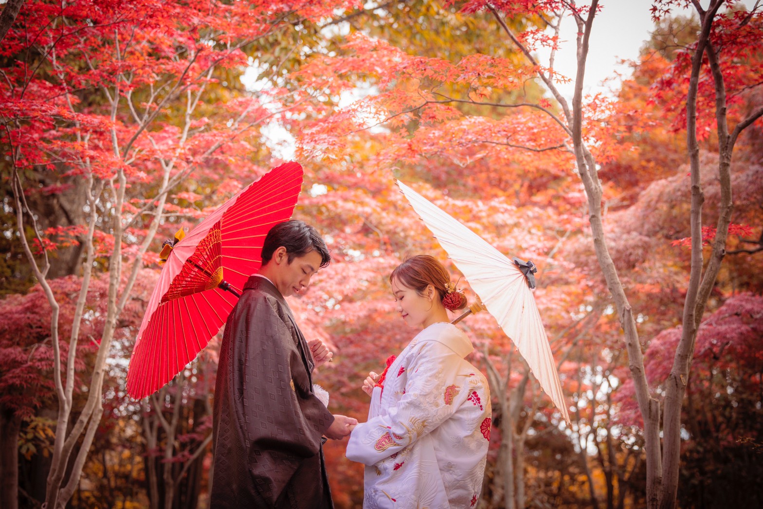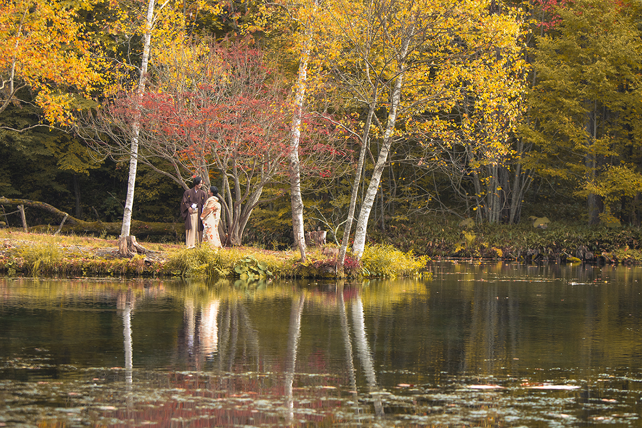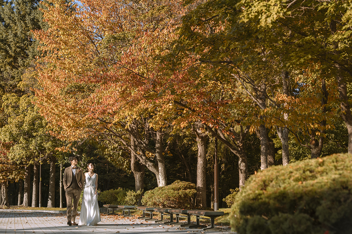 Whether you are walking hand-in-hand in a modern wedding dress or wearing a stunning traditional Japanese kimono, the rich autumn colors will make your wedding photos absolutely unforgettable.