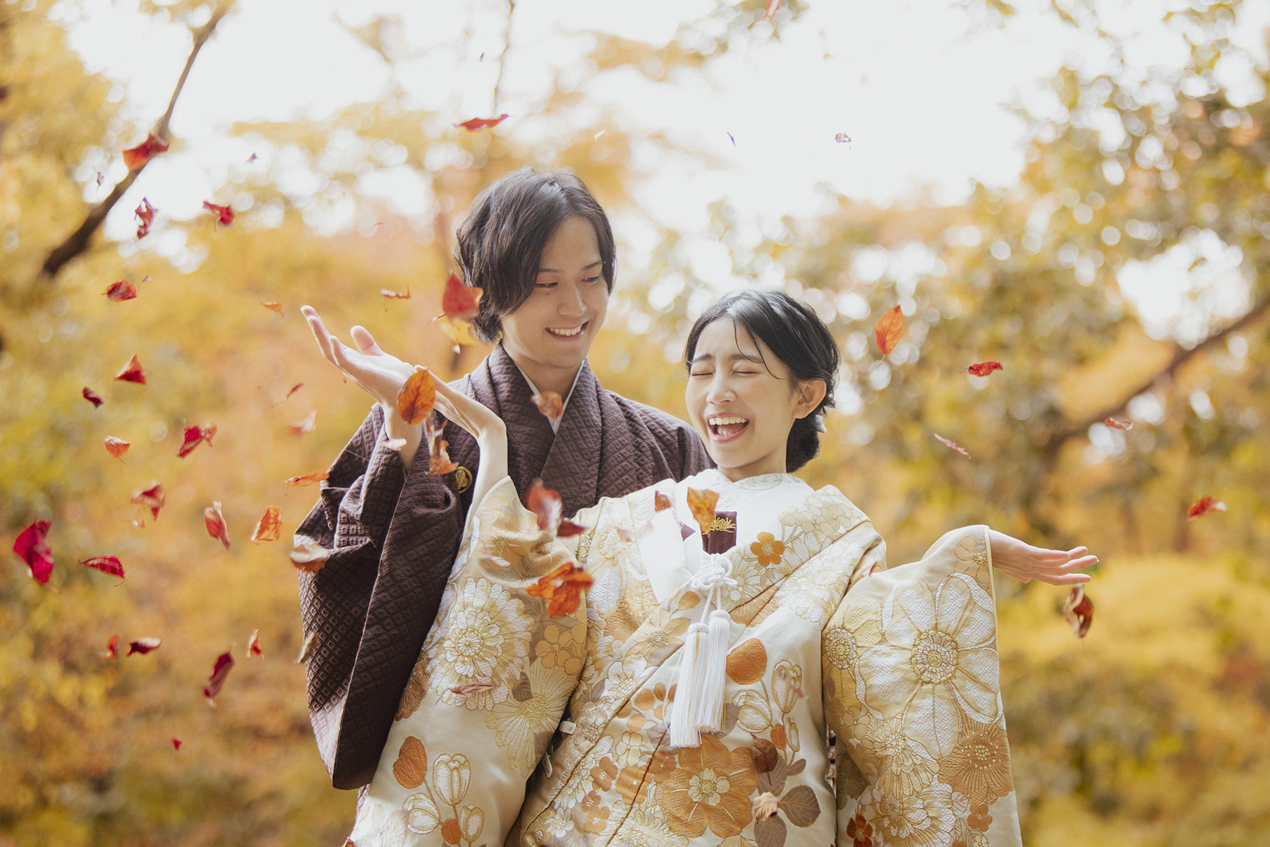One of the best parts of an autumn leaves pre-wedding in Japan is that both Western and traditional styles look spectacular against the seasonal backdrop.