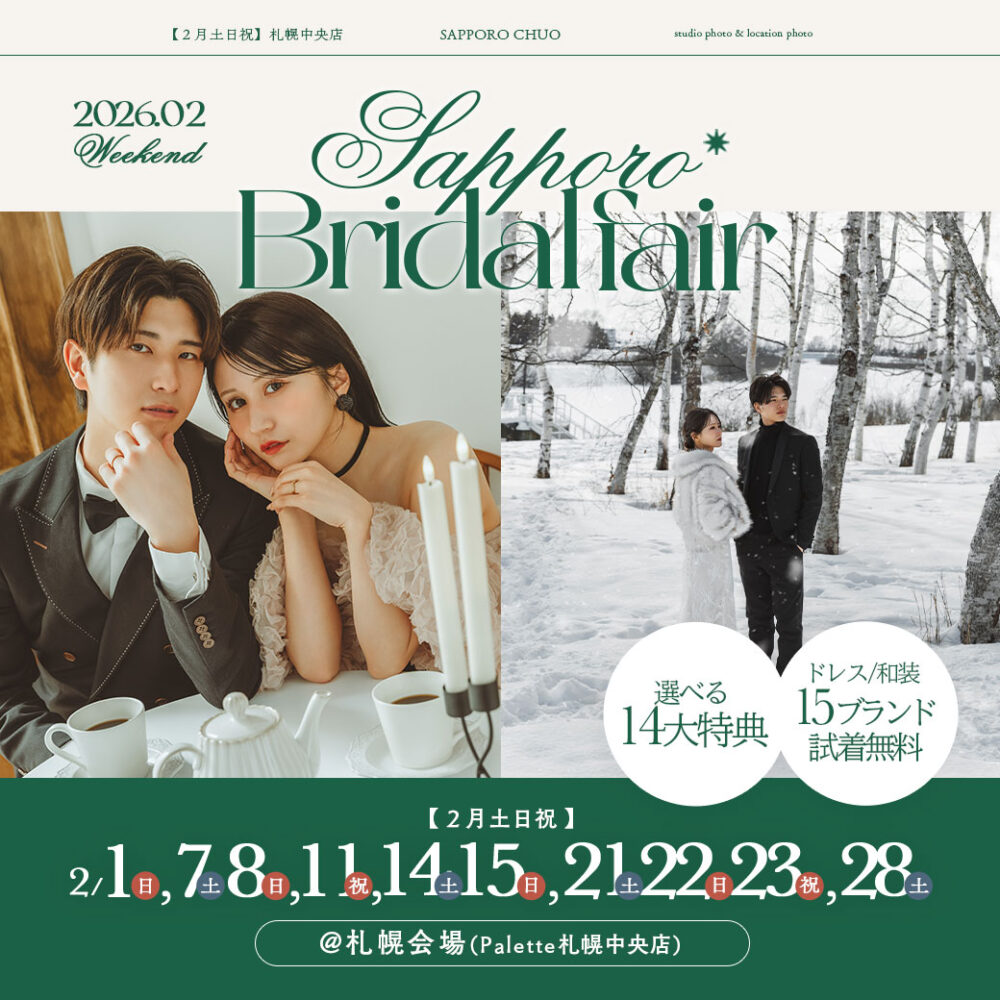 2026年2月毎週末開催!の札幌ブライダルフェアのご案内。サッポロファクトリーと、札幌大通にある札幌中央店と同時に行っております。「ビューティ専門型スタジオ」による最新衣装の無料試着のほか、フェアだからこそのお得なキャンペーン内容をご用意。