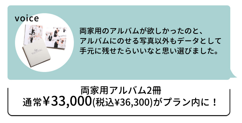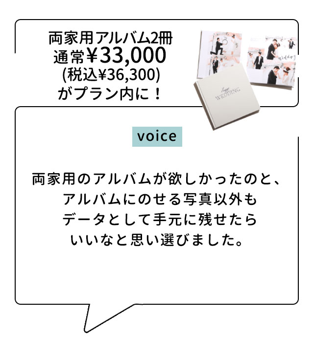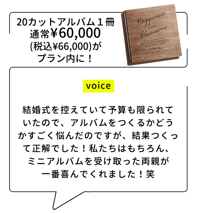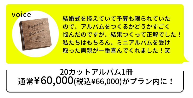 | 商品 | アルバム | コース内(10P20カット) ¥60,000 (税込¥66,000) |