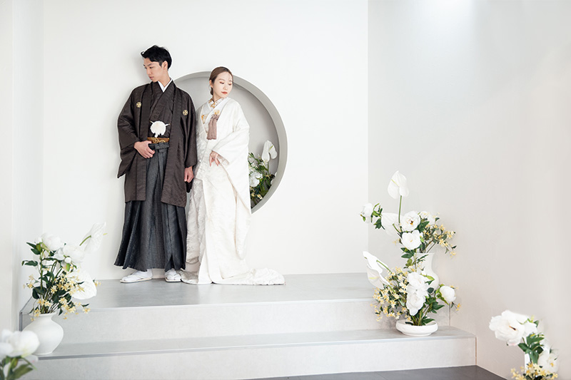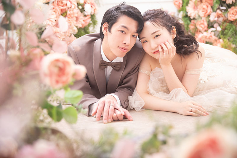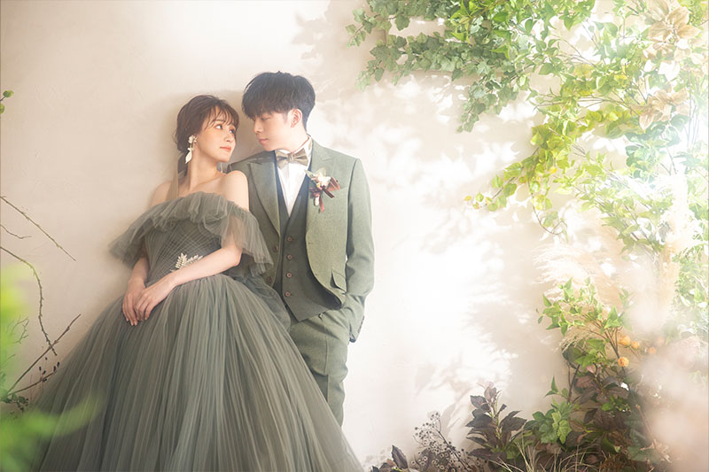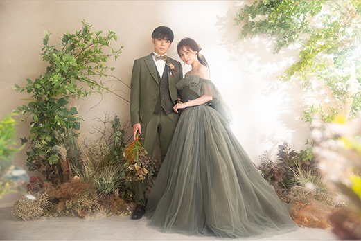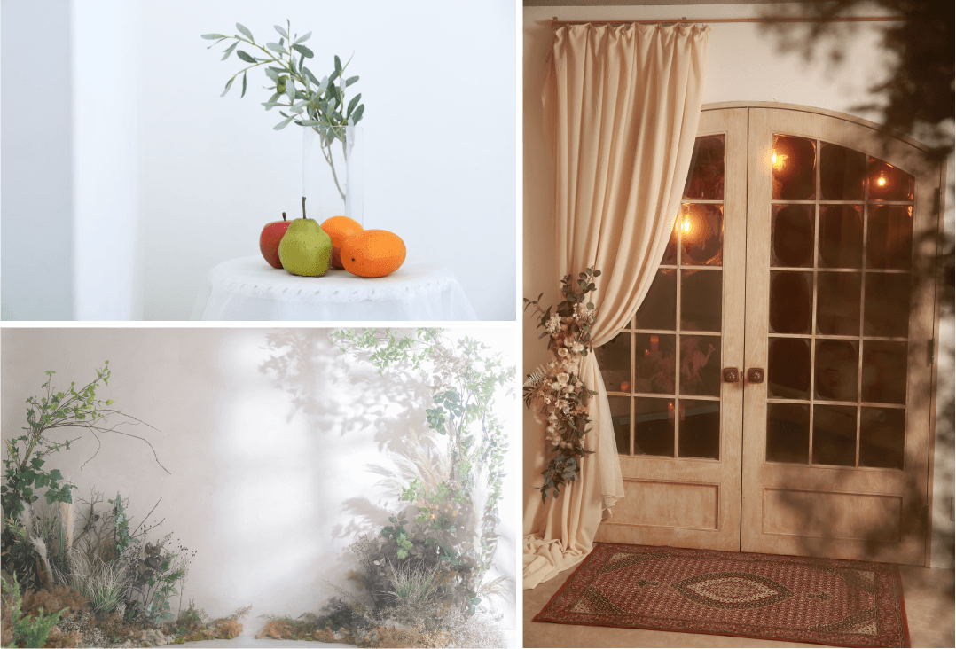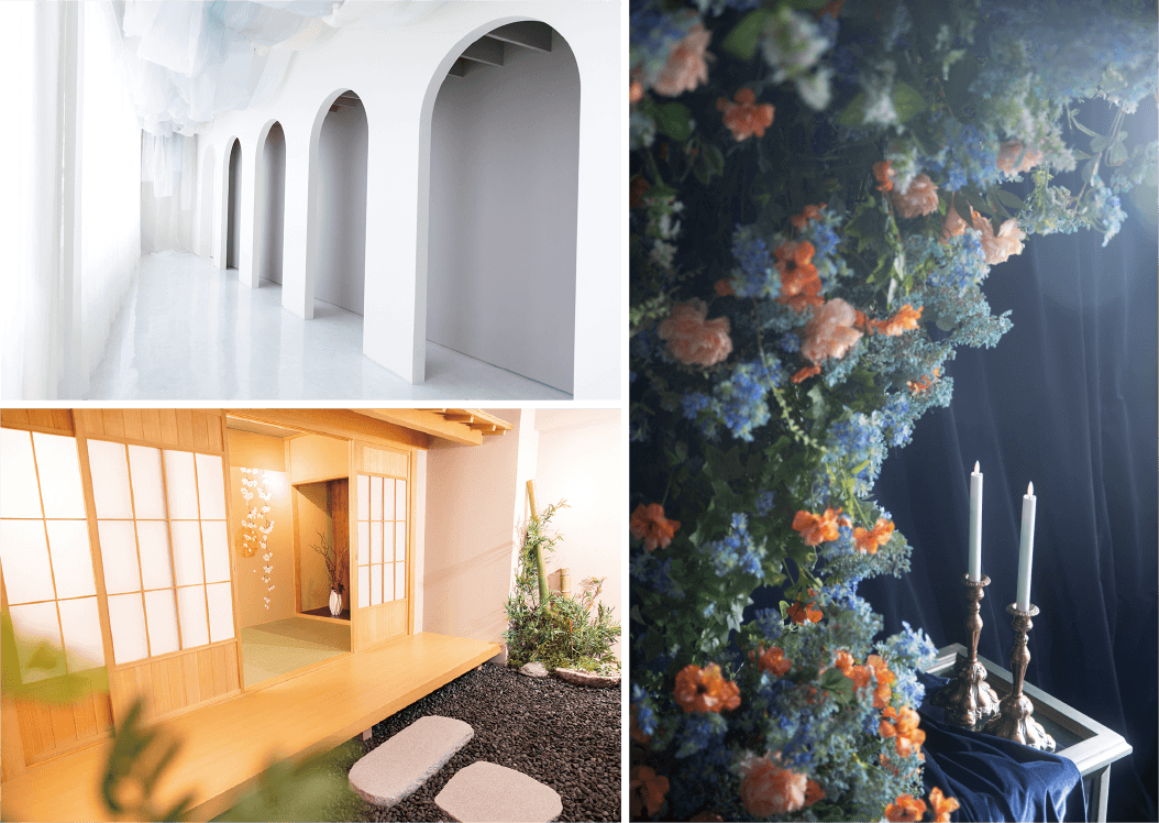 中央店では、オリジナリティーの高いスタジオセットが魅力。表現の仕方次第で、どんなテイストにもしっかりハマる。せっかくのご記念をさらに特別にしませんか。