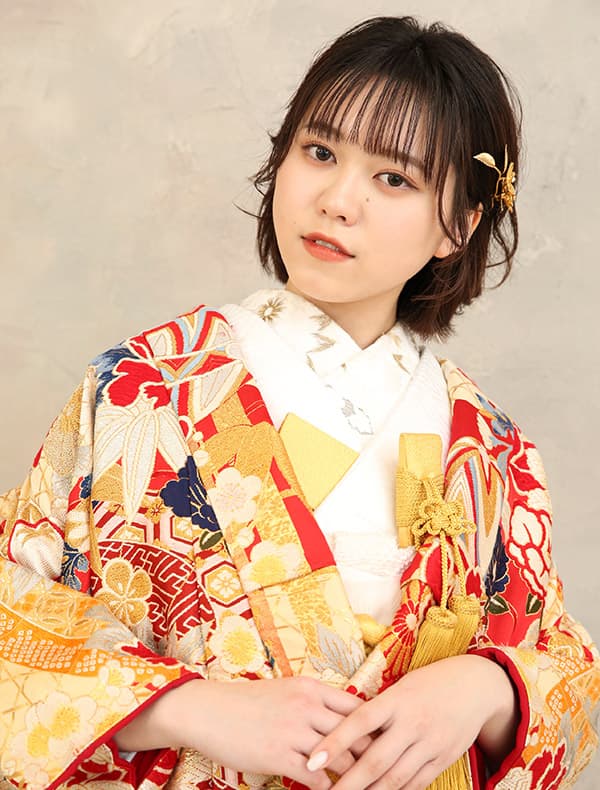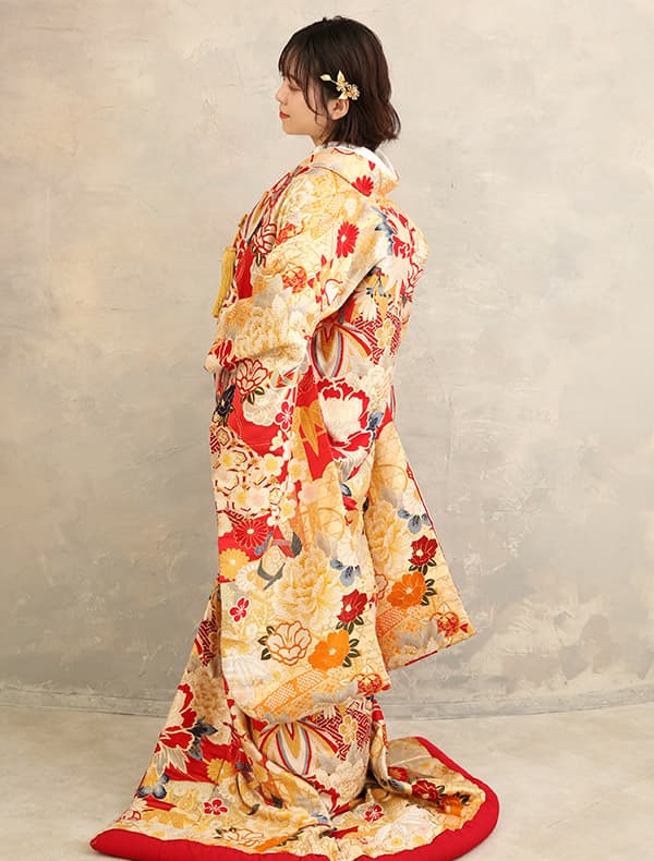 モダンな雰囲気の中にも、赤と金という王道の配色でしっかりと華やかさを感じる1着♡刺繍の輪郭がはっきり描かれているため、1つ1つがくっきり浮かび上がり印象的な色打掛です♪