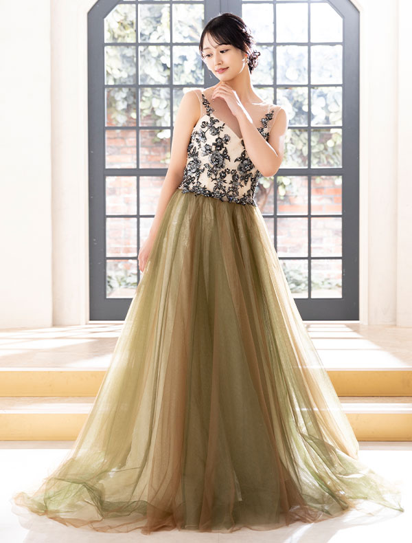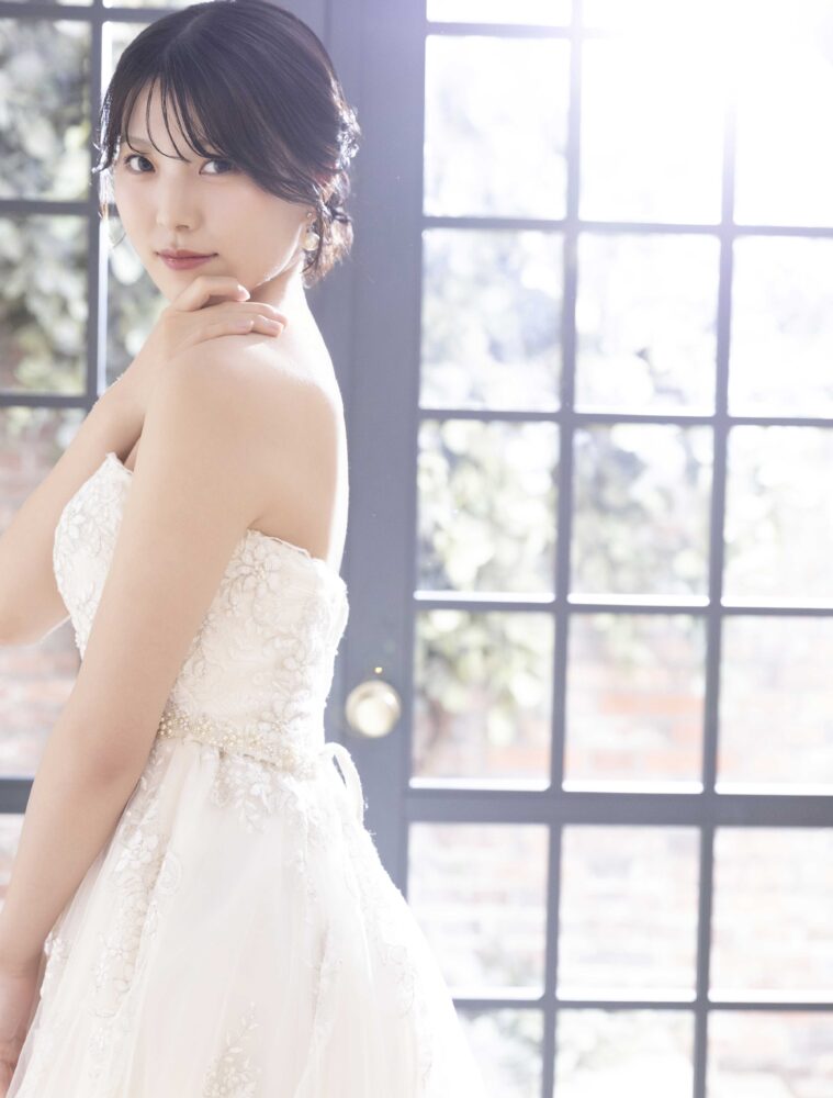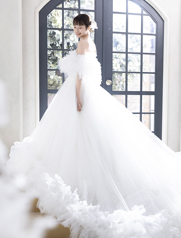 シンプルでボリュームおさえめ、すっきりとしたデザインです!上半身のレースは凝ったデザインで、こだわりのお嫁様にオススメ!