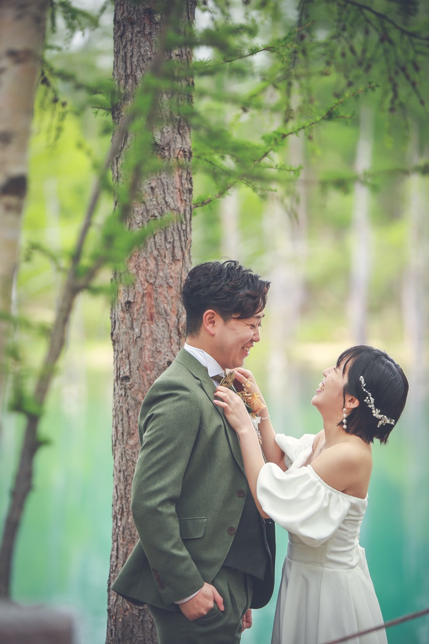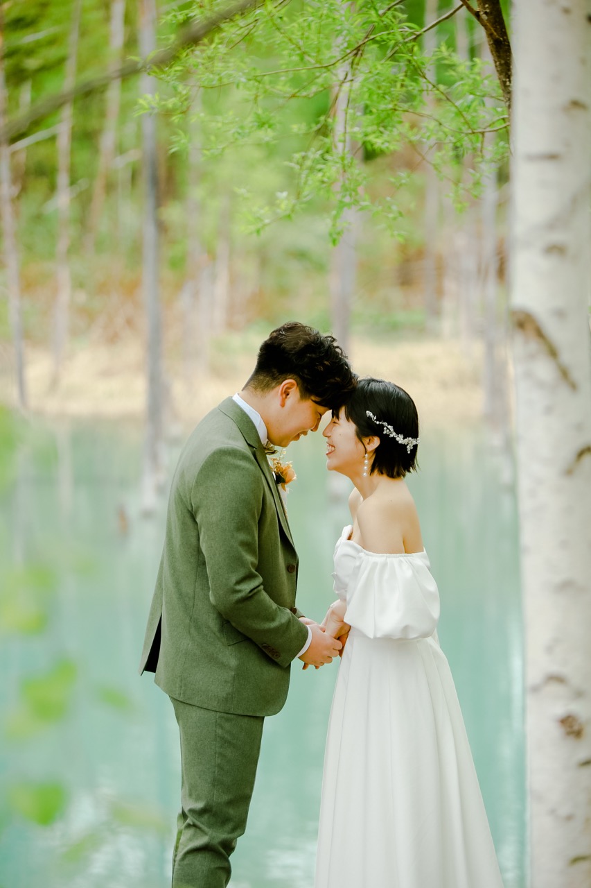 春の柔らかな光は、花嫁の肌を美しく照らし、神秘的な青い池を背景にしたウェディングフォトは、お二人の純粋な愛を永遠に封じ込めます。