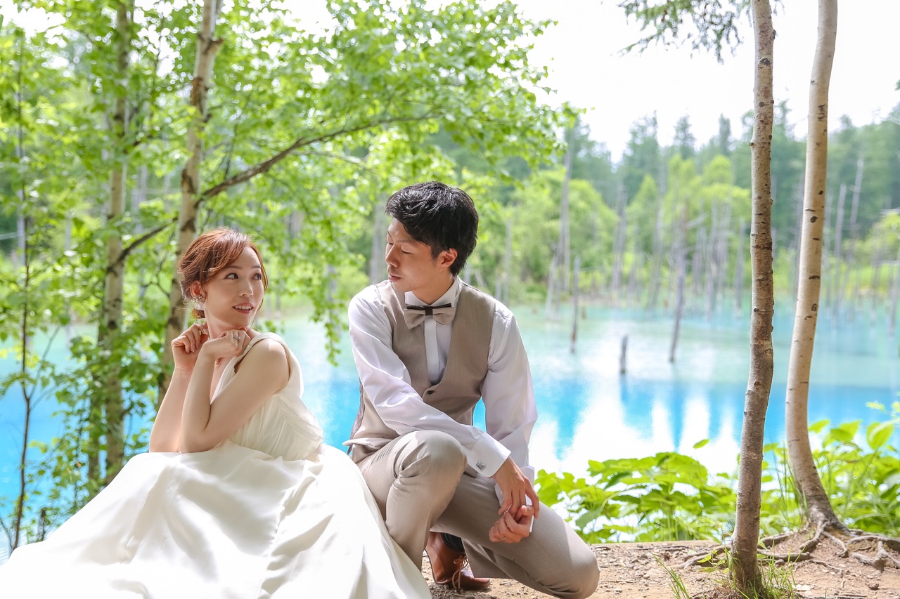 真夏の太陽が輝く美瑛 青い池は、鮮やかさがピークに達する、ロケーションフォトに最適なスポットです。