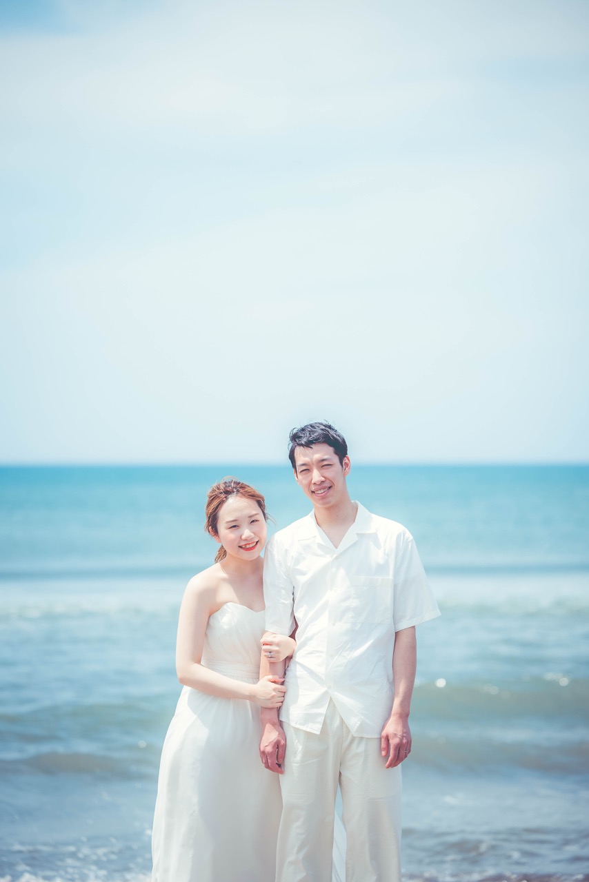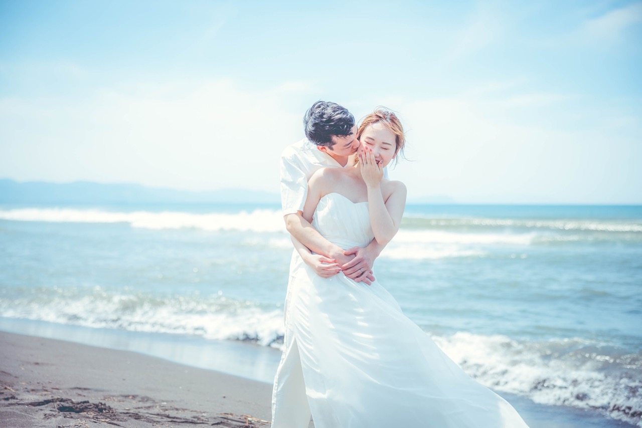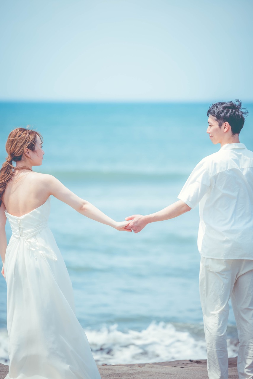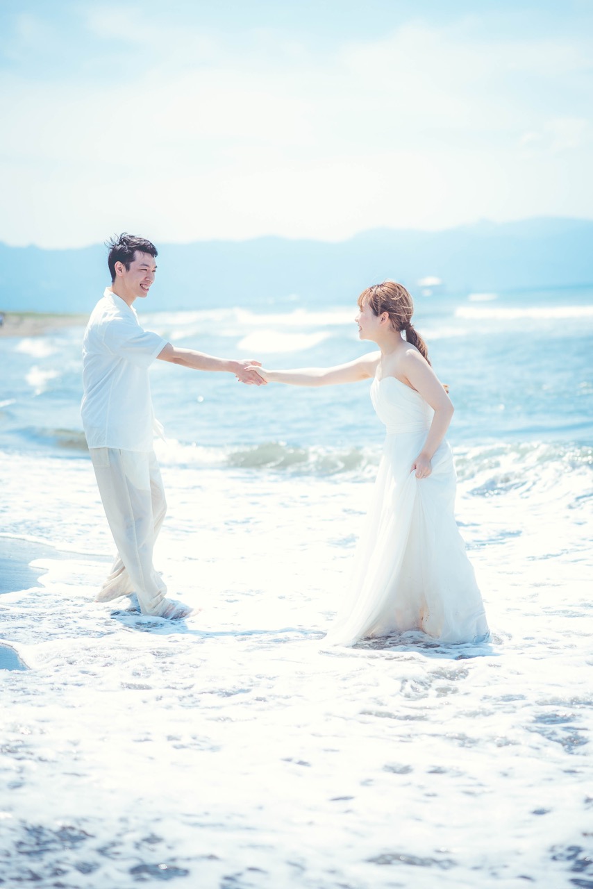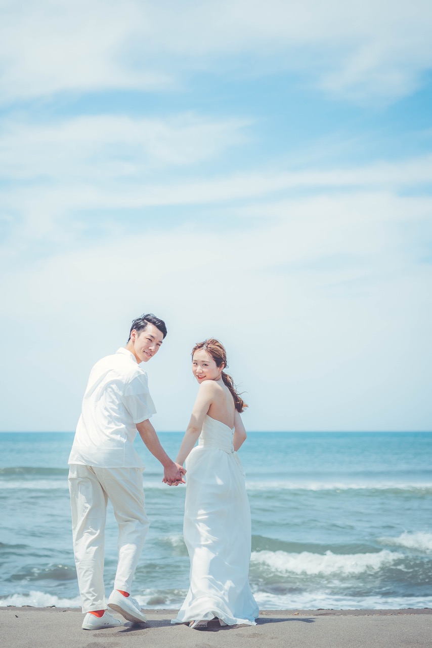 日中の明るい時間帯は、青い空と海、白い砂浜がウェディングドレスの純白を際立たせ、開放感あふれる爽快なロケーションフォトを実現します。