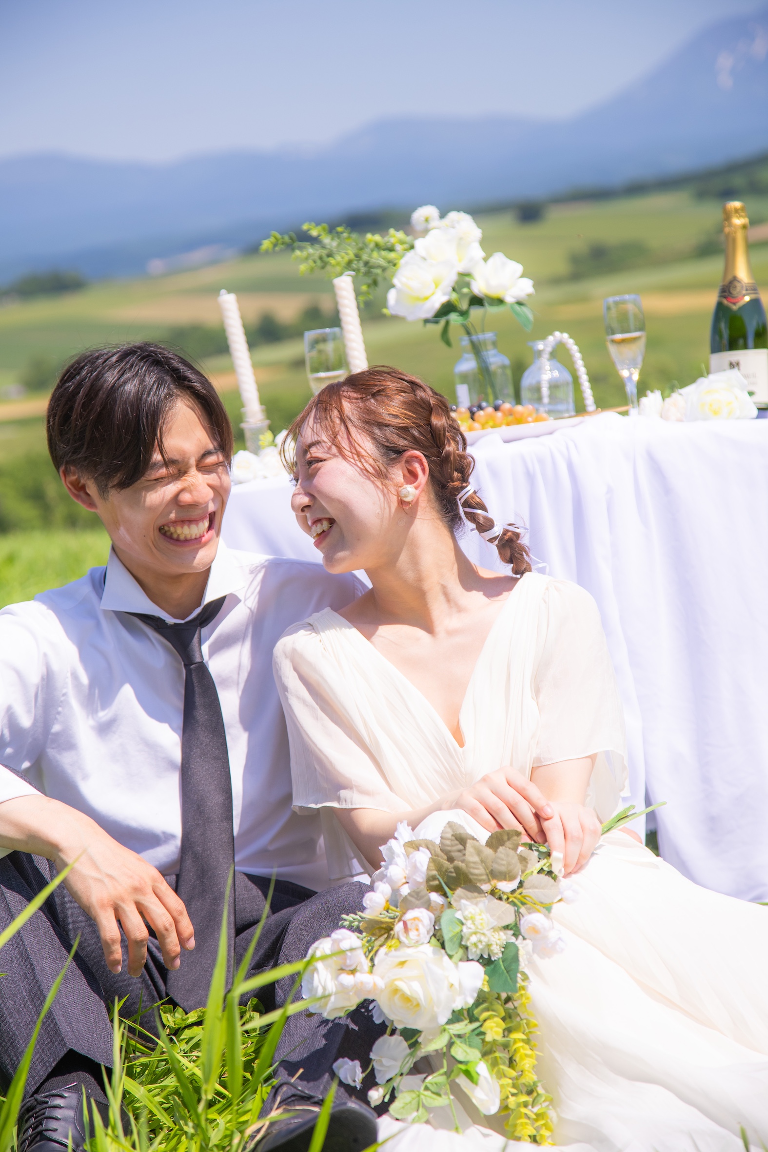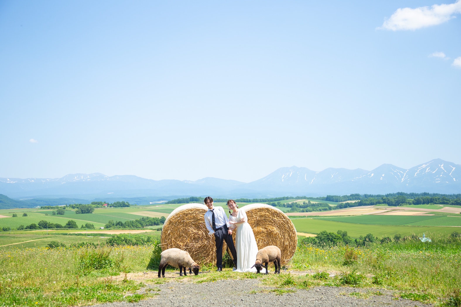 動物たちとの触れ合い(オプション)も可能で、自然体の笑顔を引き出す最高の舞台です。美瑛の風を感じながら、記憶に残るブライダルロケーション撮影を千代田ファームで実現しませんか。