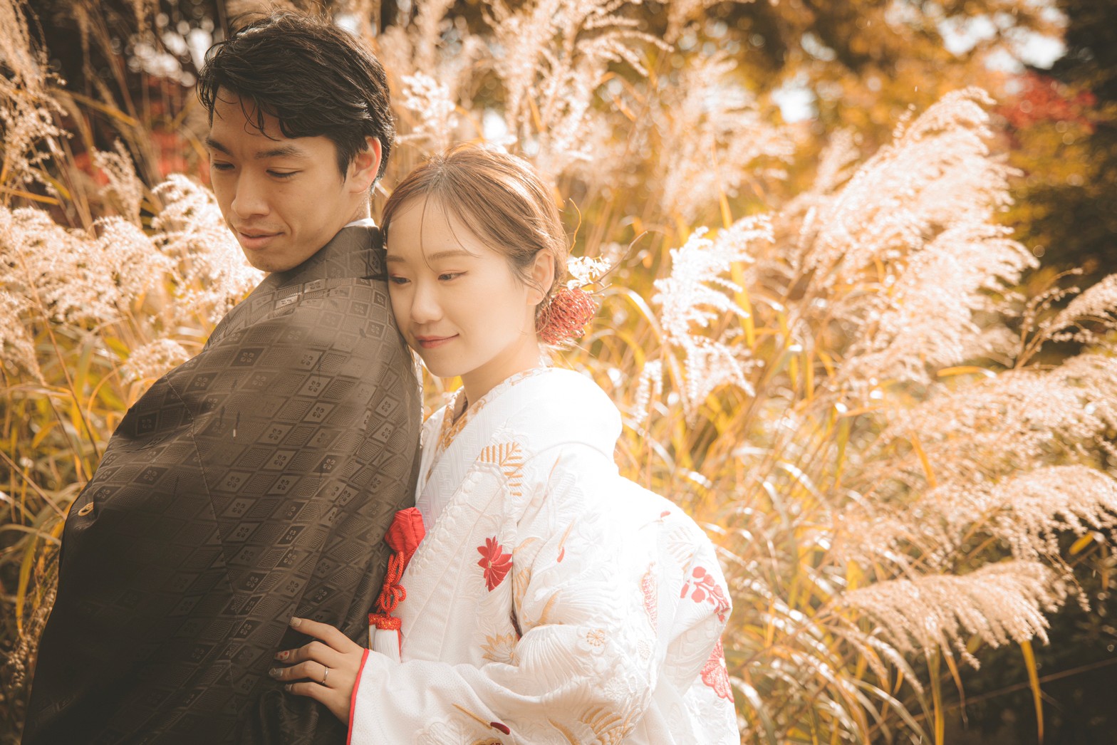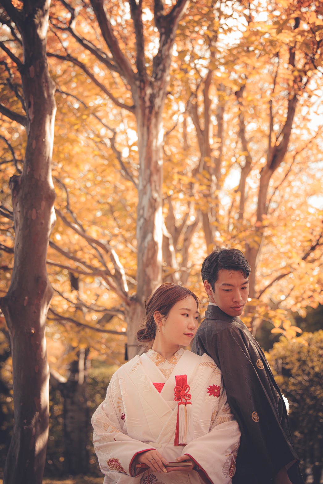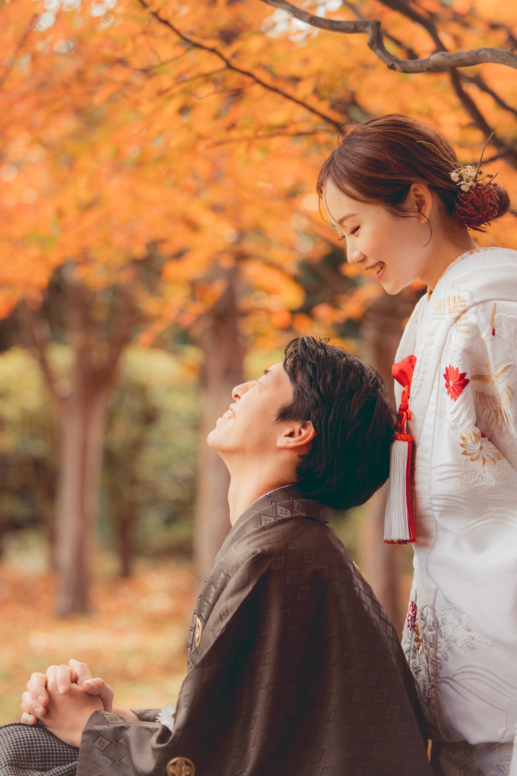 日本庭園のモミジやカエデが一斉に色づく様は、息をのむ美しさ。朱色や黄金色に染まる長い並木道や池を背景に、色打掛や白無垢が雅に映えます。落ち着きと情緒ある秋限定の絶景で、格調高くも温かいお二人の愛の物語を写真に残しませんか?