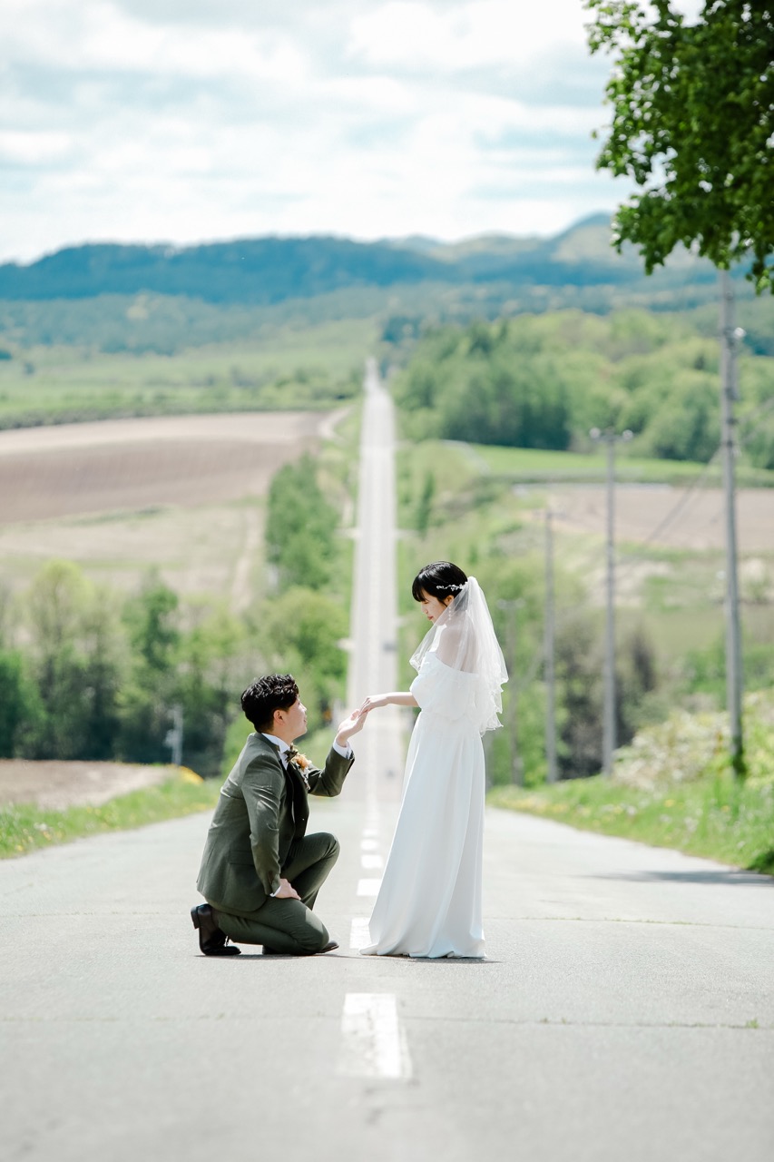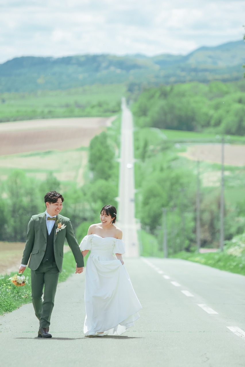 北海道のロケーションフォトで、ドラマティックな一枚を残したいお二人へ。旭川と上富良野の境界線に位置するジェットコースターの路は、まさに圧巻のウェディングフォトスポット。道の直線とカーブが織りなすダイナミックな構図は、他では決して得られないスケール感です。