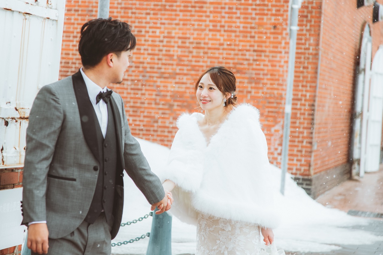 歴史情緒あふれる金森赤レンガ倉庫は、港町の異国情緒とレトロな赤レンガが調和する人気のロケーションフォトスポットです。北海道らしい開放感と、函館ならではのクラシックな背景で、一生の思い出に残る最高のブライダルフォトを叶えます。