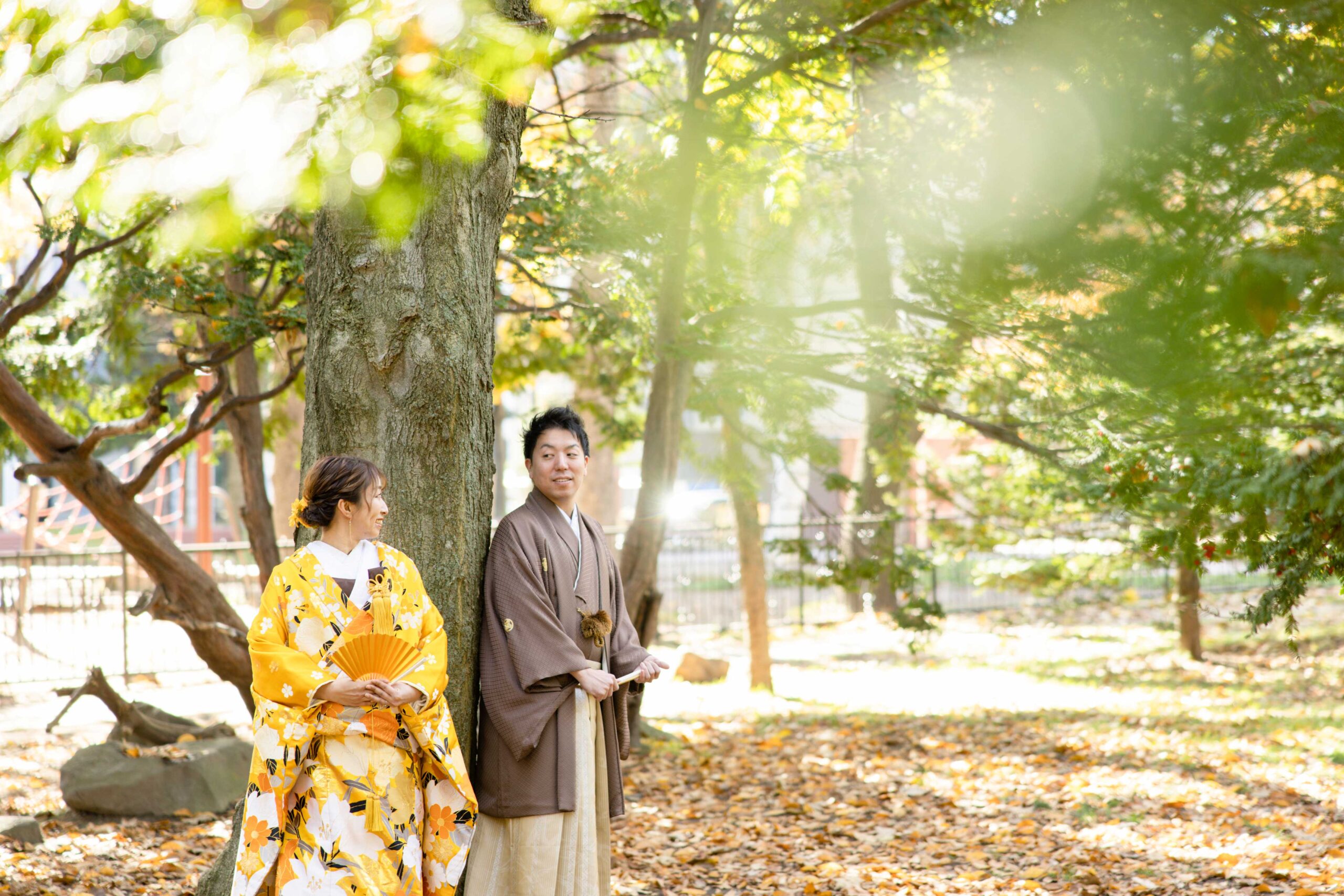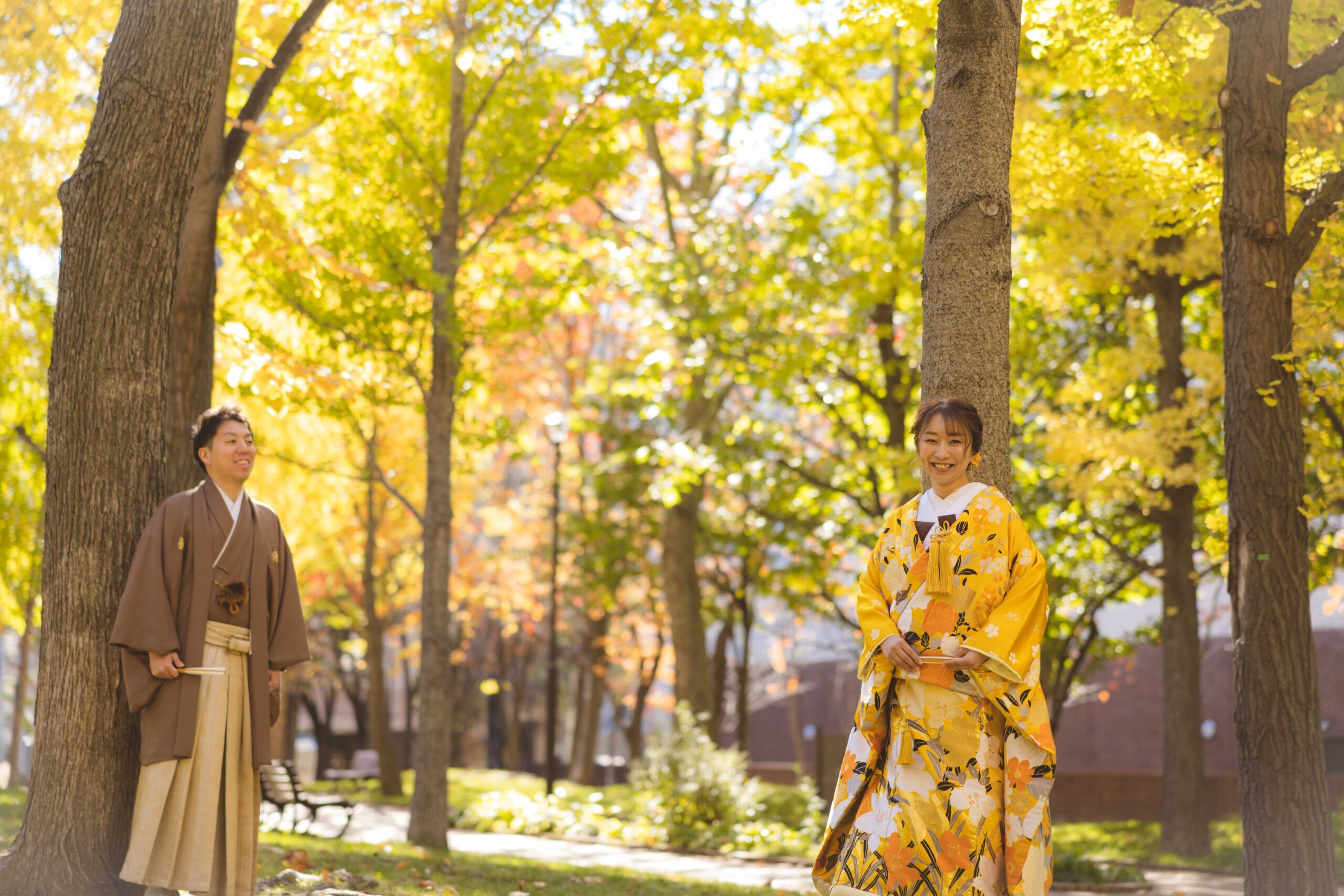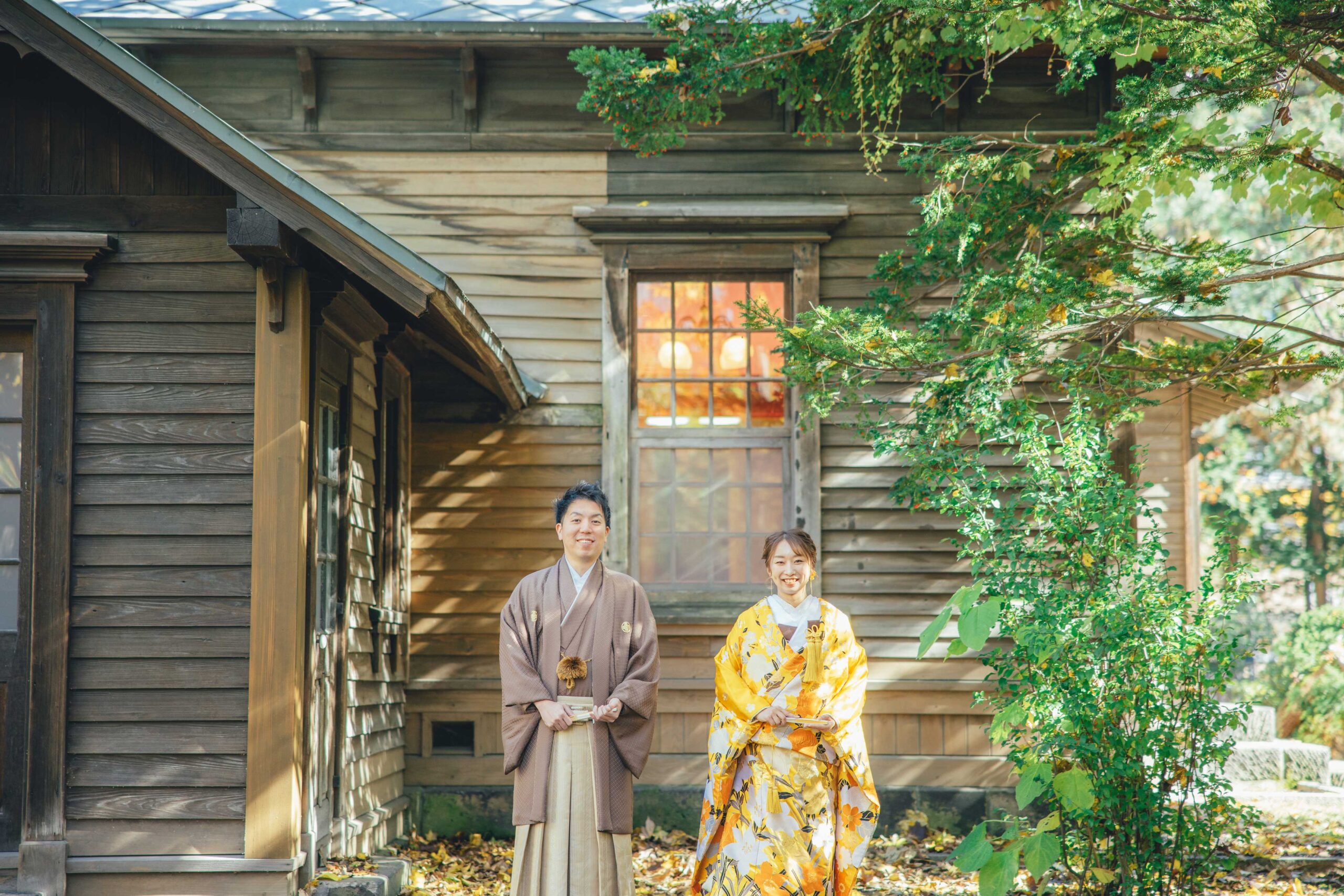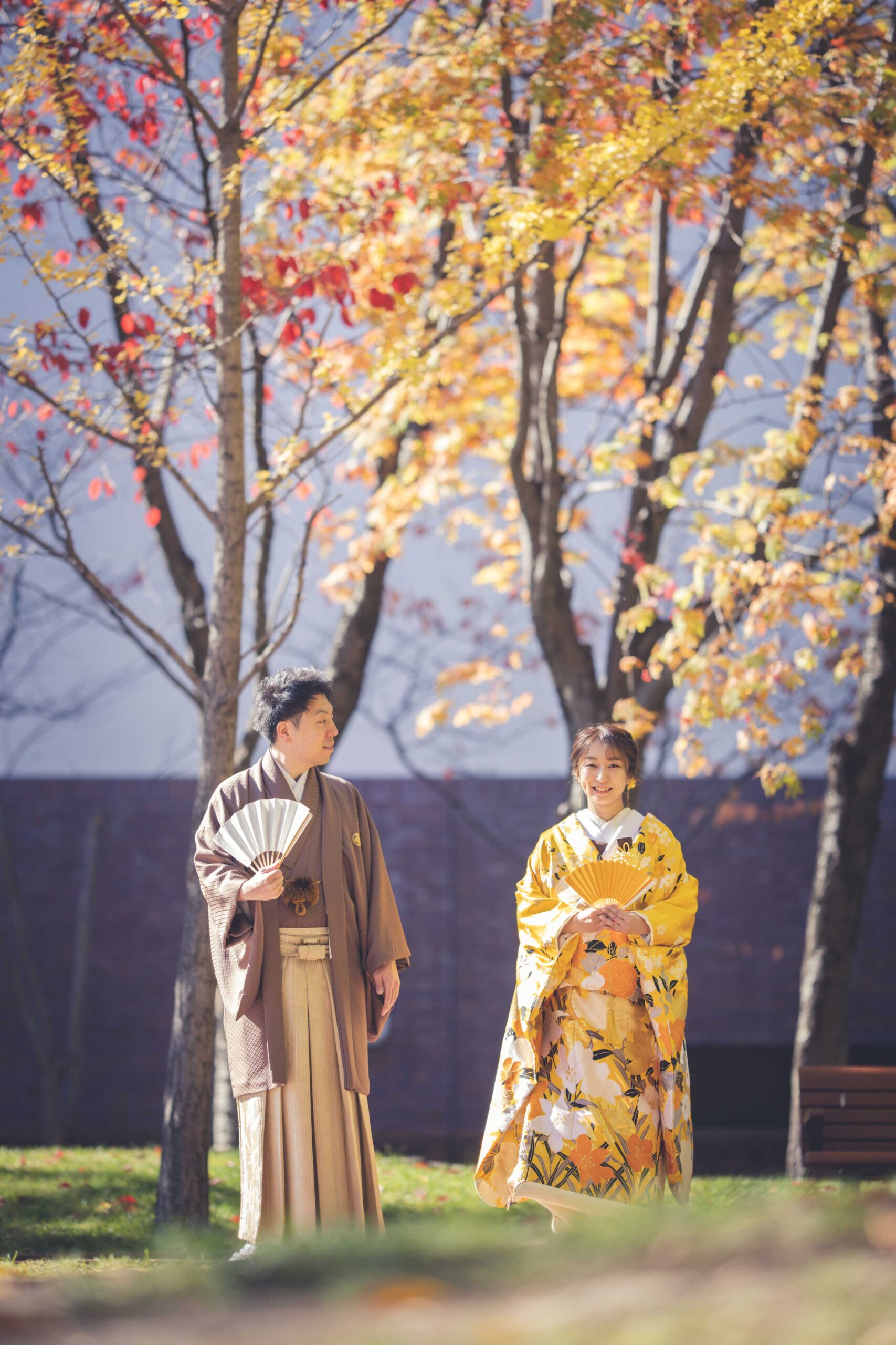 秋の旧永山邸は、紅葉とレトロなレンガ造りが調和し、情緒深く格調高い雰囲気に。和装・洋装どちらも深みのある色彩で撮れる、大人でロマンティックなウェディングフォトロケにおすすめ。