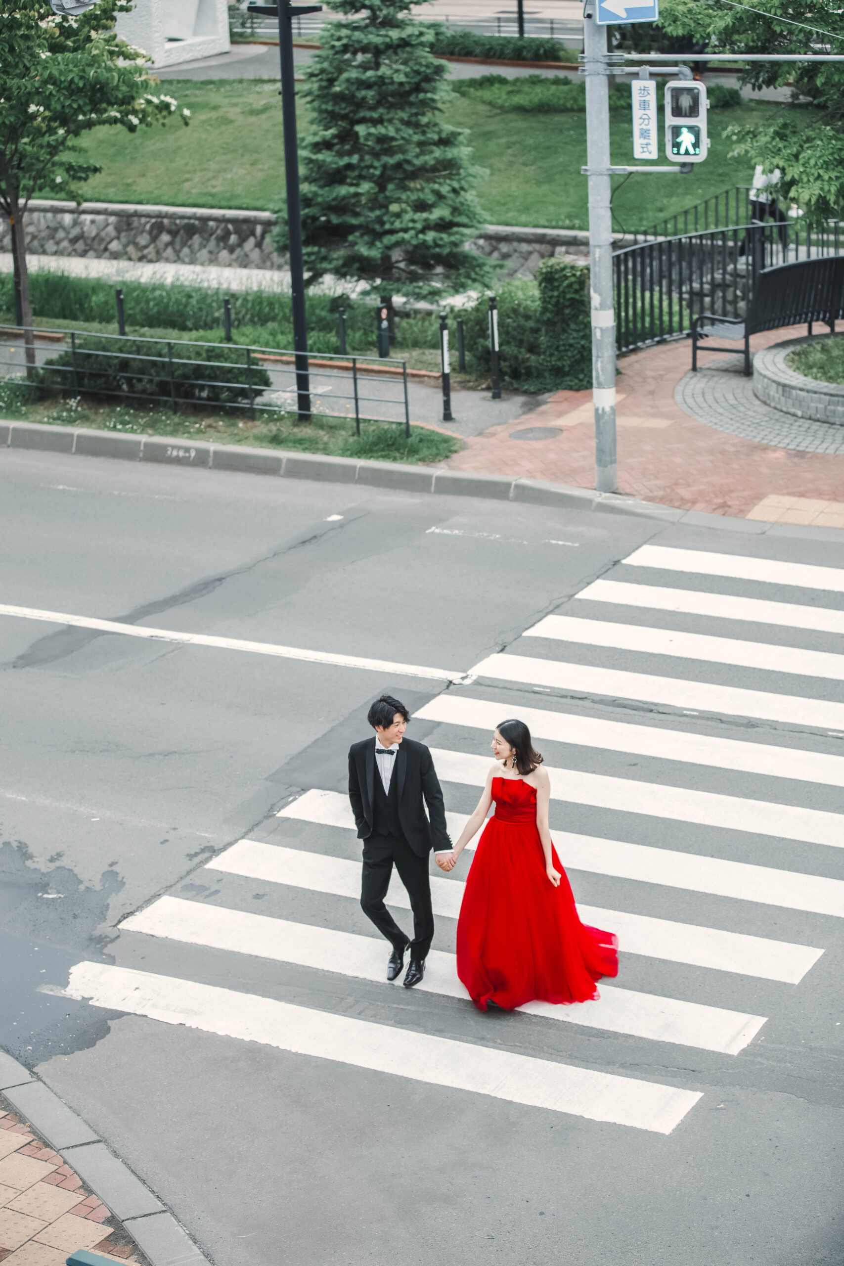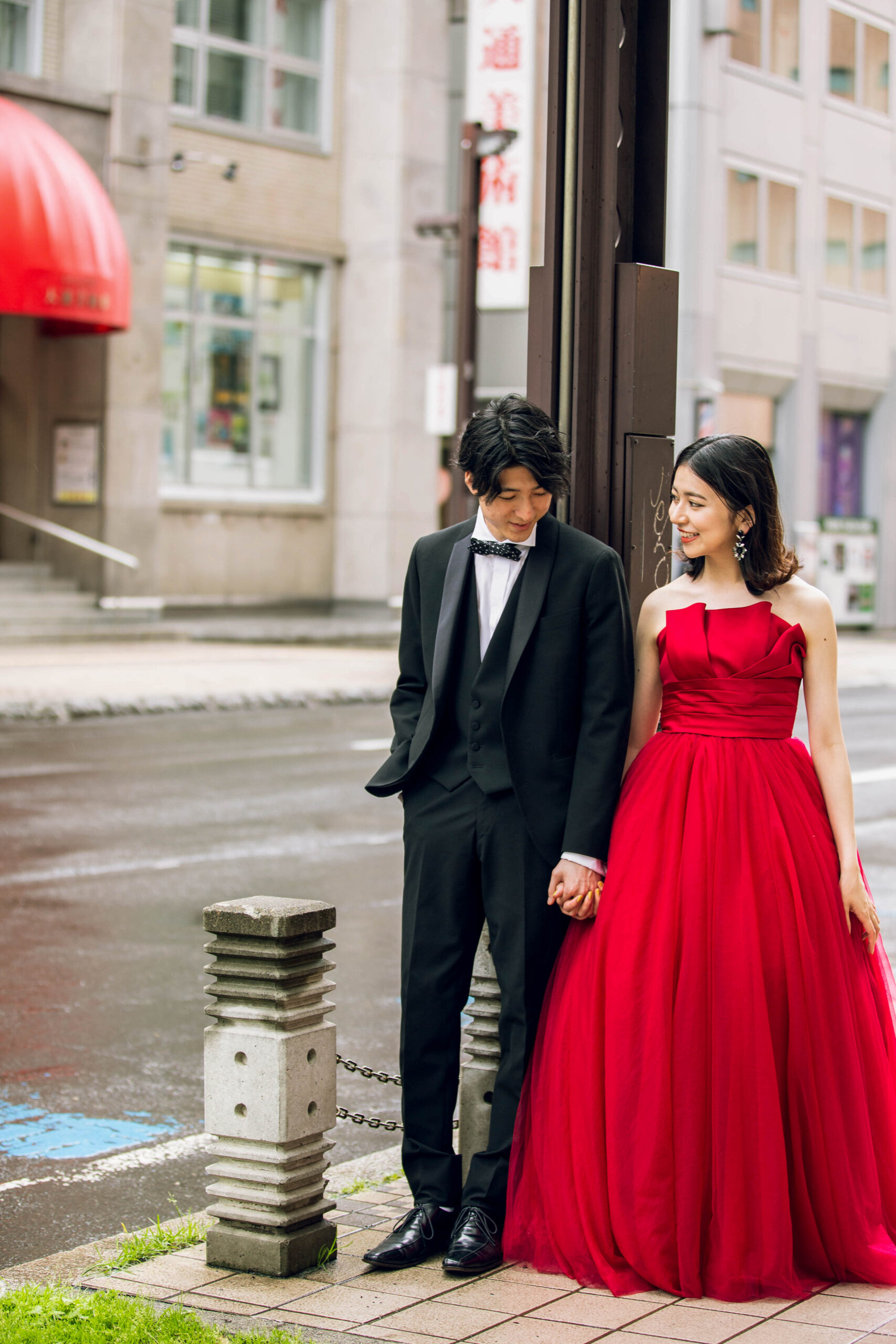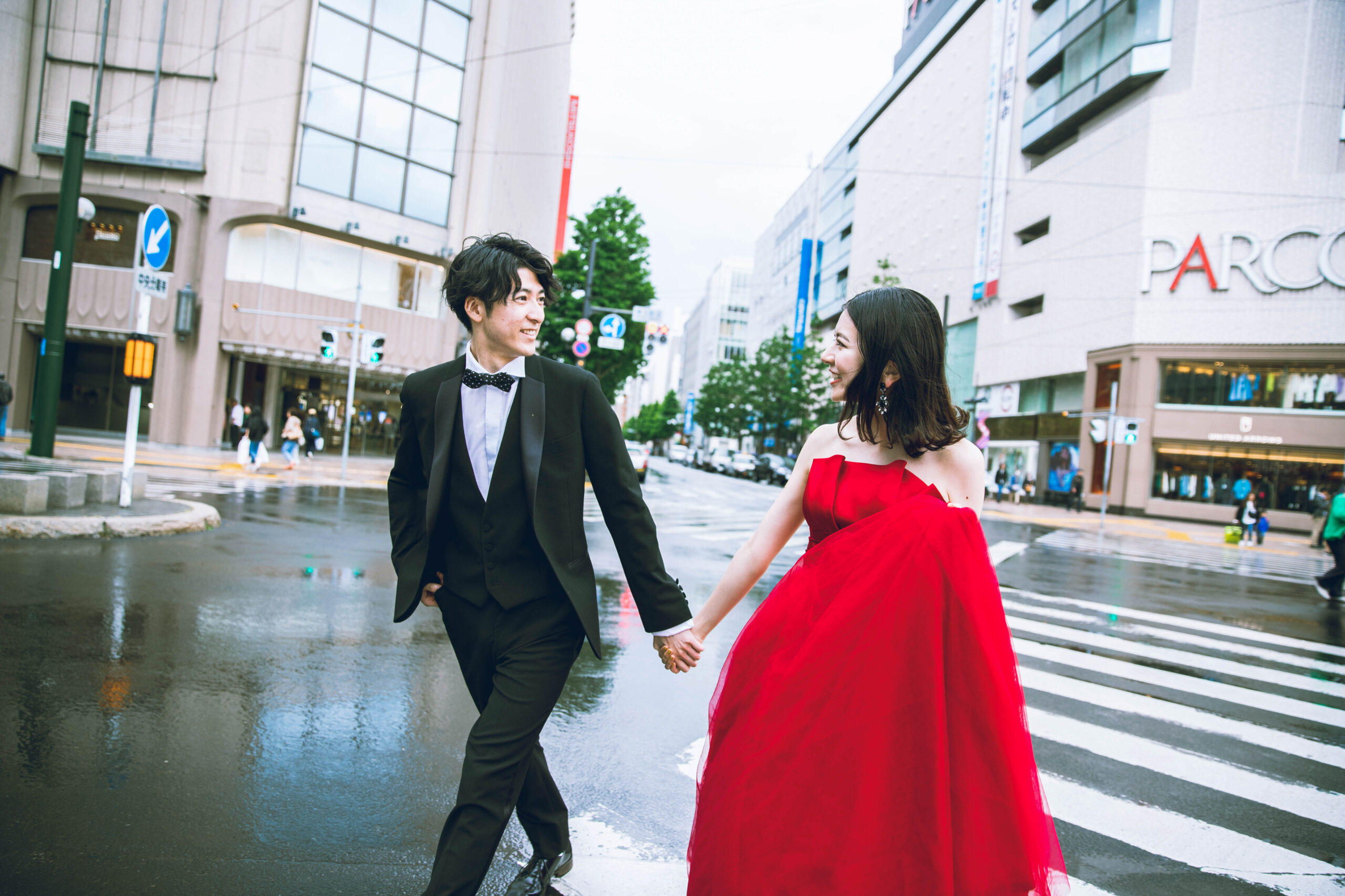 大通街(大通公園周辺)では、札幌テレビ塔やモダンな街並みを背景に、都会的でスタイリッシュなショットが叶います。四季の花々や噴水、夜のイルミネーションを活かしたドラマチックな前撮りに街ロケにおすすめ。