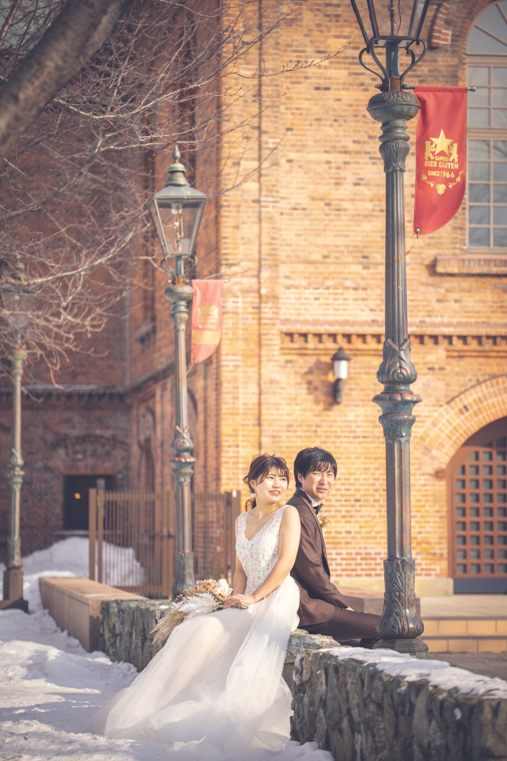 冬のサッポロビール園は、純白の雪と重厚な赤レンガのコントラストが際立つ、幻想的な世界。ダイナミックでレトロな背景の中で、温もりと風格あるウェディングフォトロケにおすすめ。