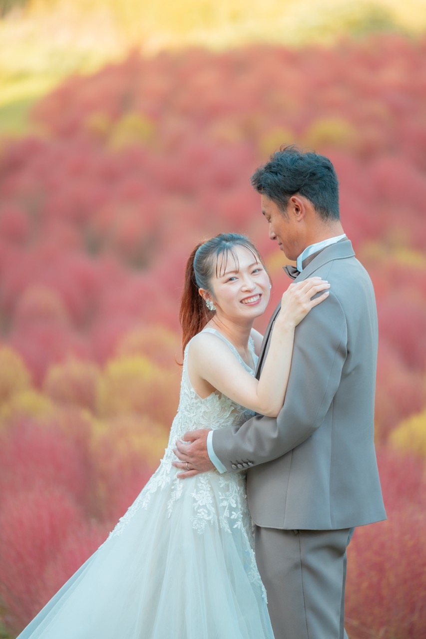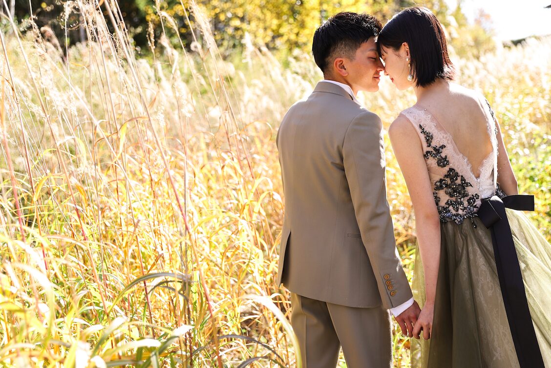 紅や黄金色に染まる木々を背景に、おふたりらしい印象的な一枚に。