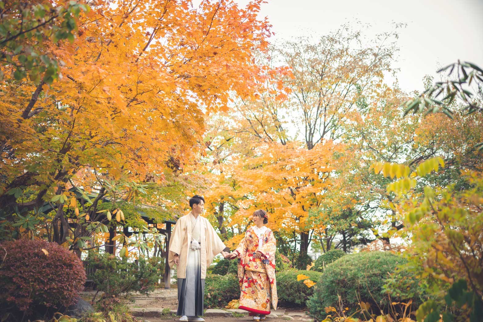 この黄金色の景色を背景にした和装フォトは、格調高く落ち着いた雰囲気となり、大人の魅力を際立たせます。