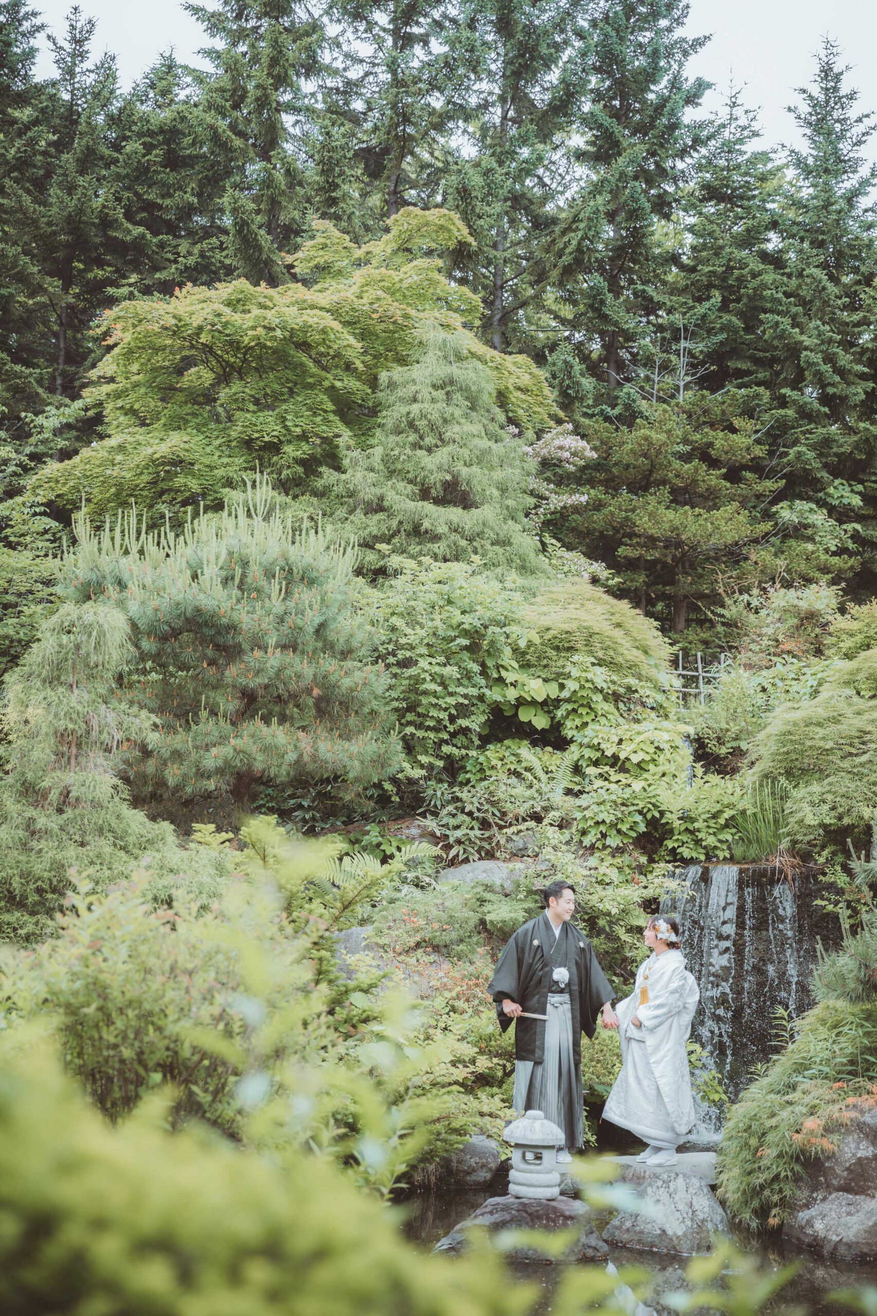 昼の天神山緑地は、豊かな自然と和風庭園、そして季節ごとの美しい花々が魅力。和装も洋装も、ナチュラルで優美な雰囲気の中で撮れる、ウェディングフォトロケにおすすめ。