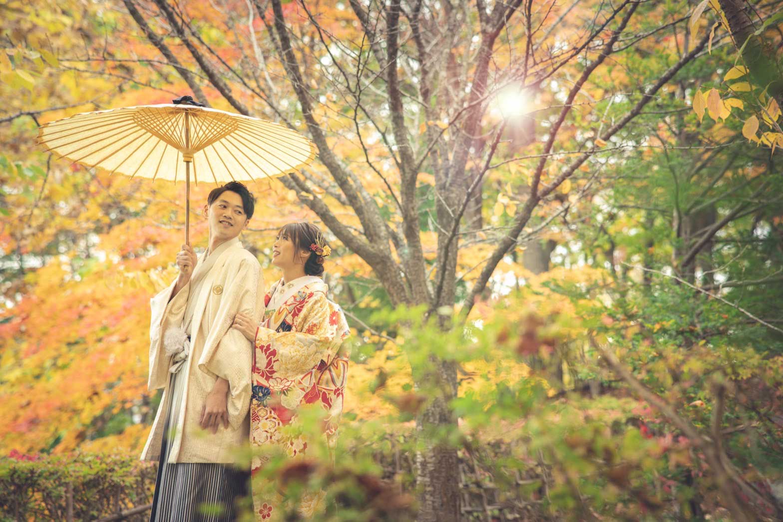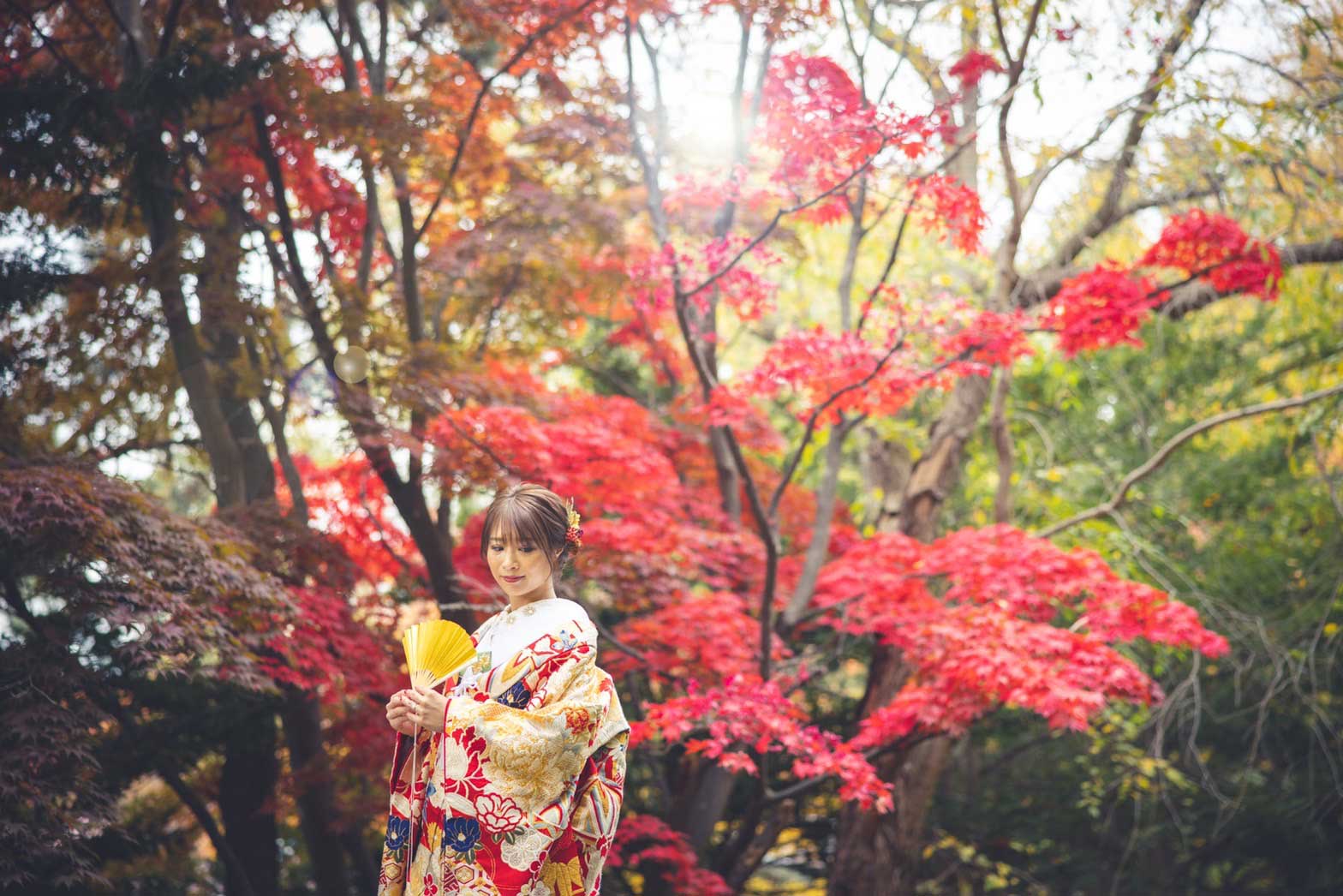 秋は、紅葉が池の水面に映り込む幻想的な情景の中で、情緒深く落ち着いた雰囲気の撮影が可能です。