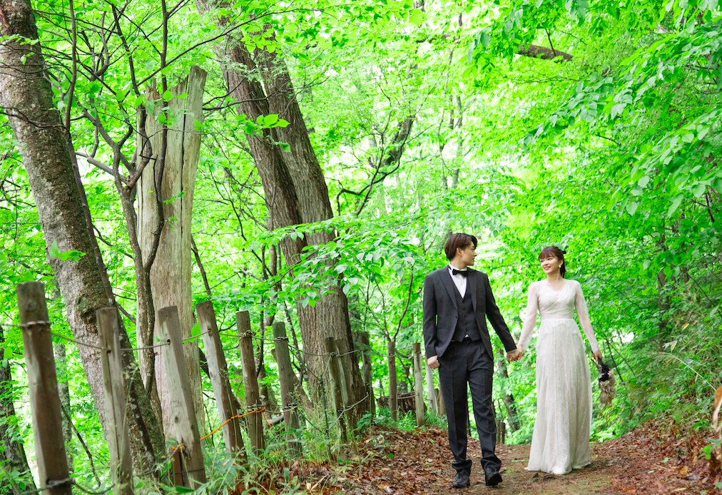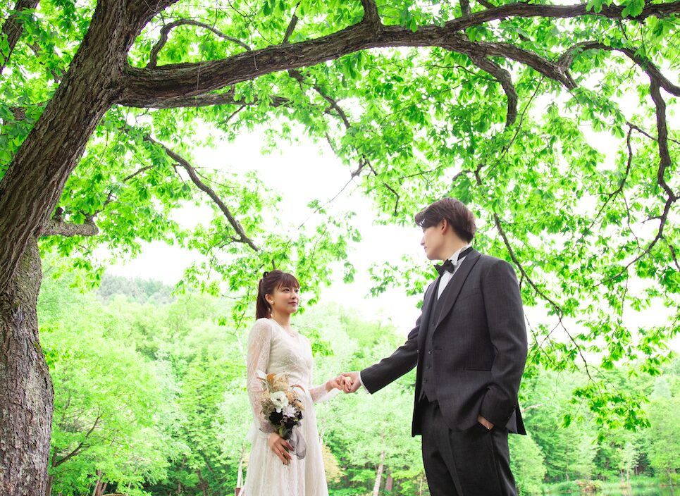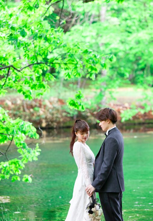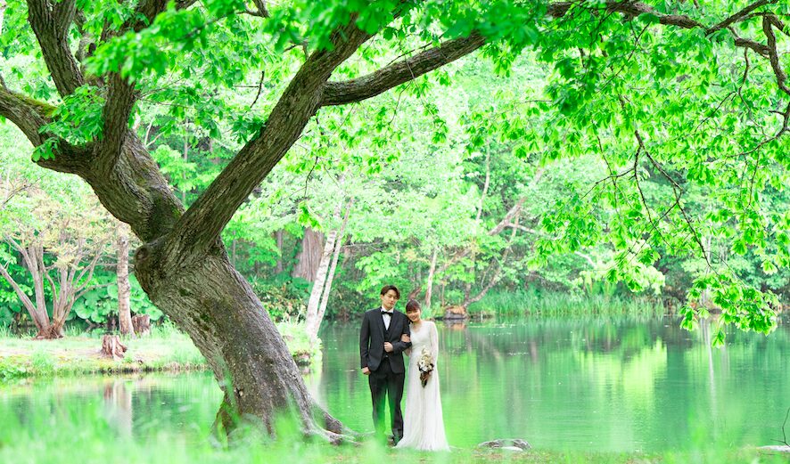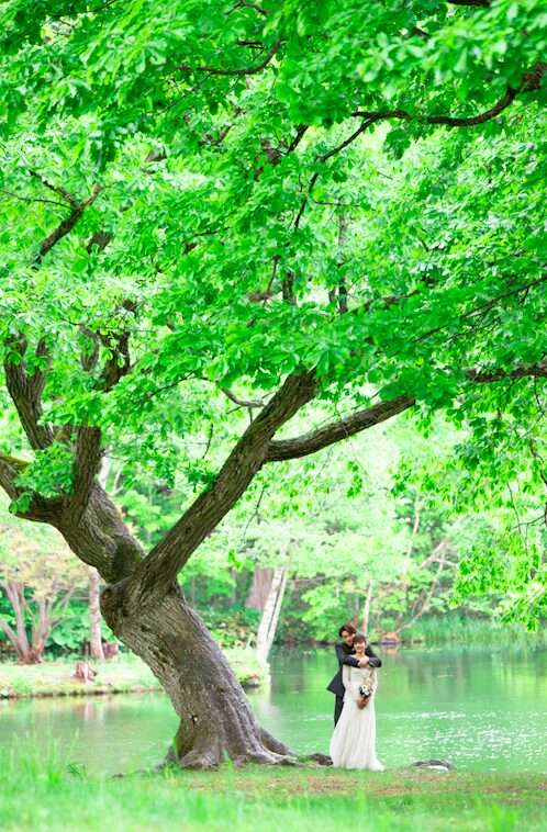 北海道・富良野にある鳥沼公園は、新緑や夏の自然に包まれたナチュラルなウェディングフォトにぴったりのロケーションです。