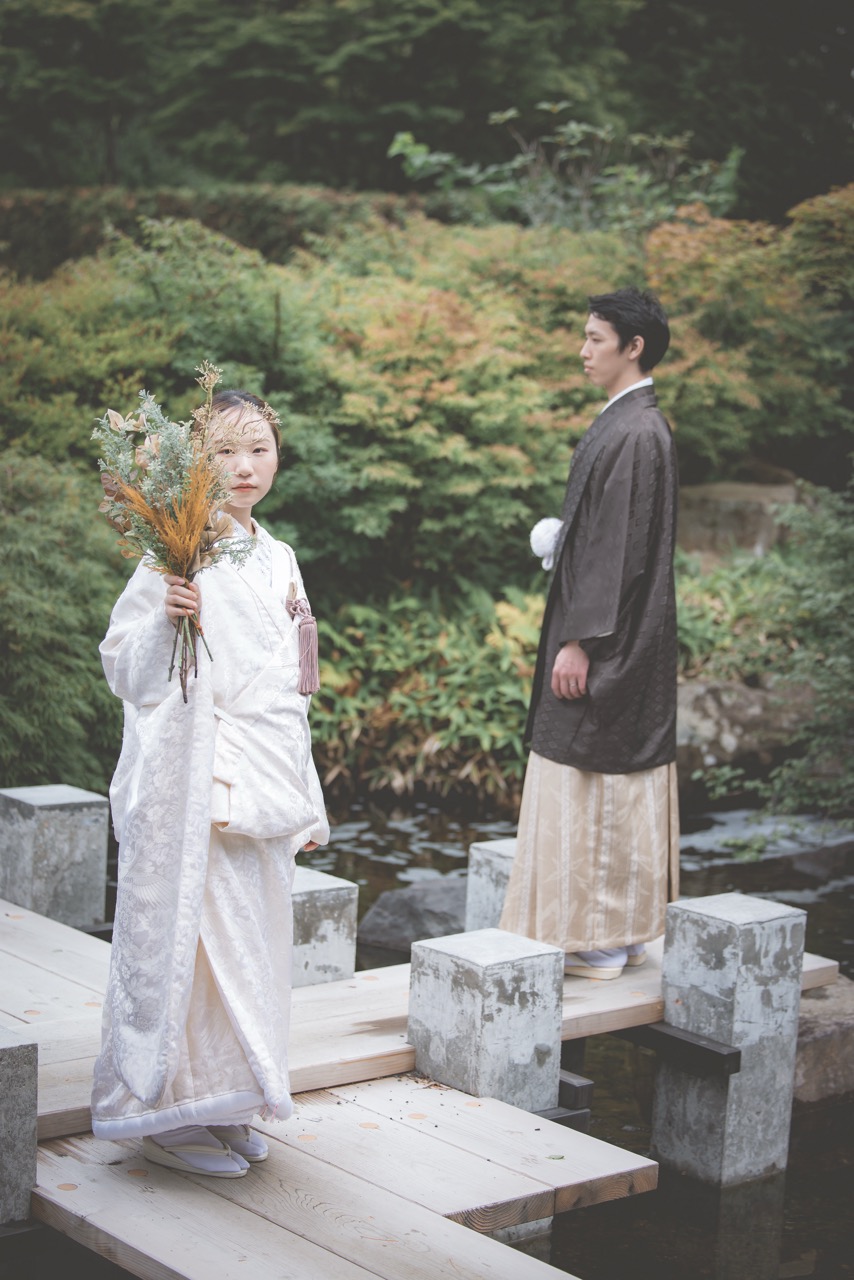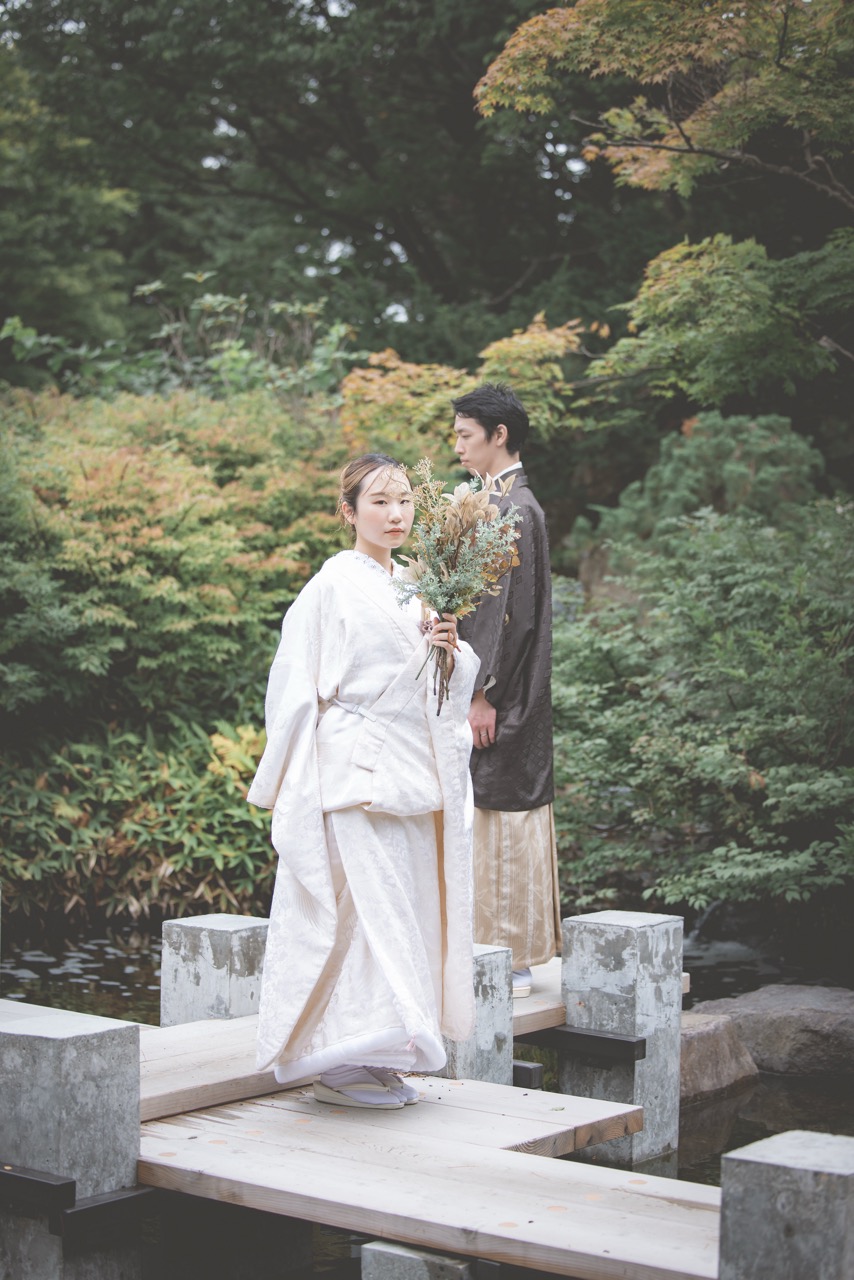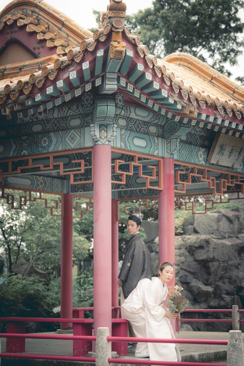 秋には、落ち着いた色合いに染まる中国庭園の建築や池の静けさが、和装・洋装問わず趣のある個性的な撮影を可能にします。