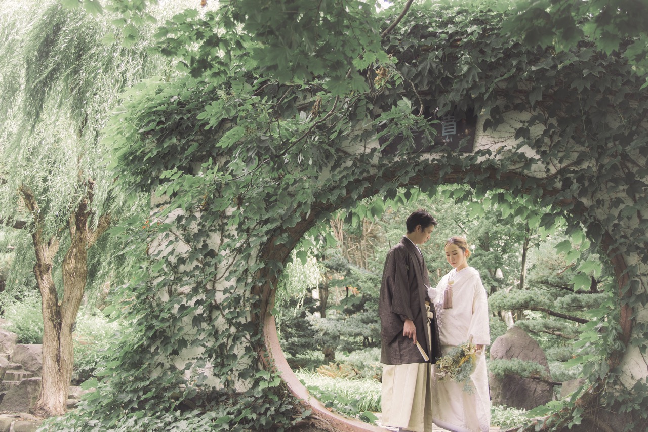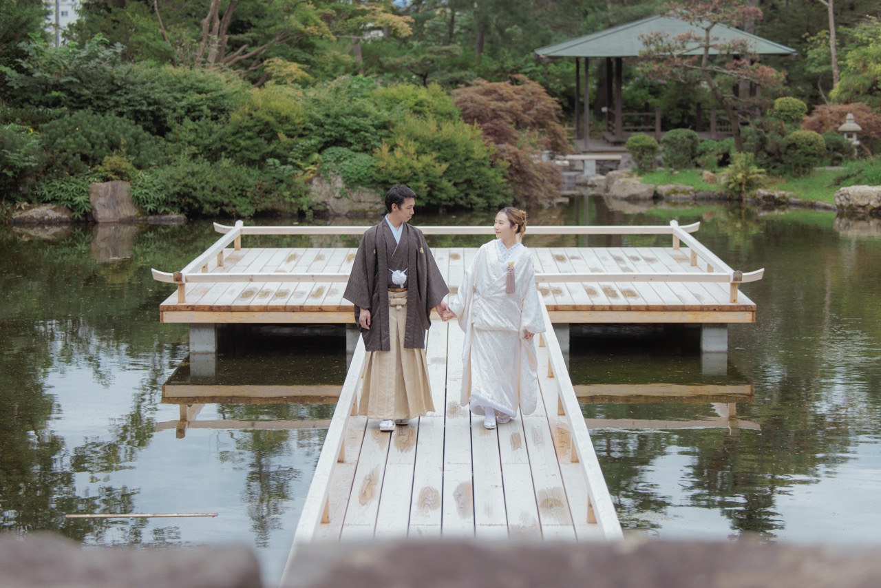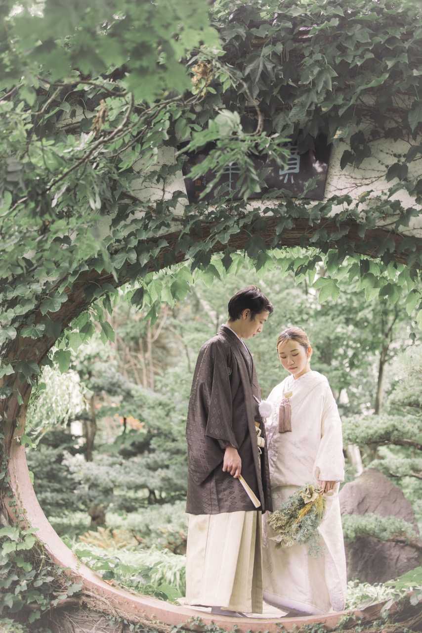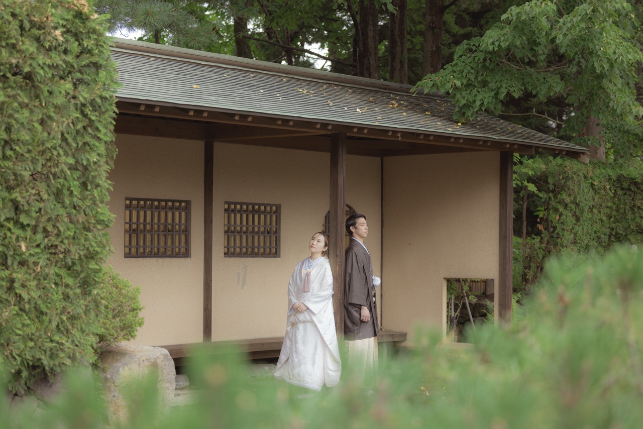百合が原公園の世界の庭園では、本格的な洋風庭園や中国庭園など、異国情緒あふれるウェディングフォトを撮影できます。色とりどりの花々や、ユニークな建築物を背景に、華やかで多様な表情のロケにおすすめ。