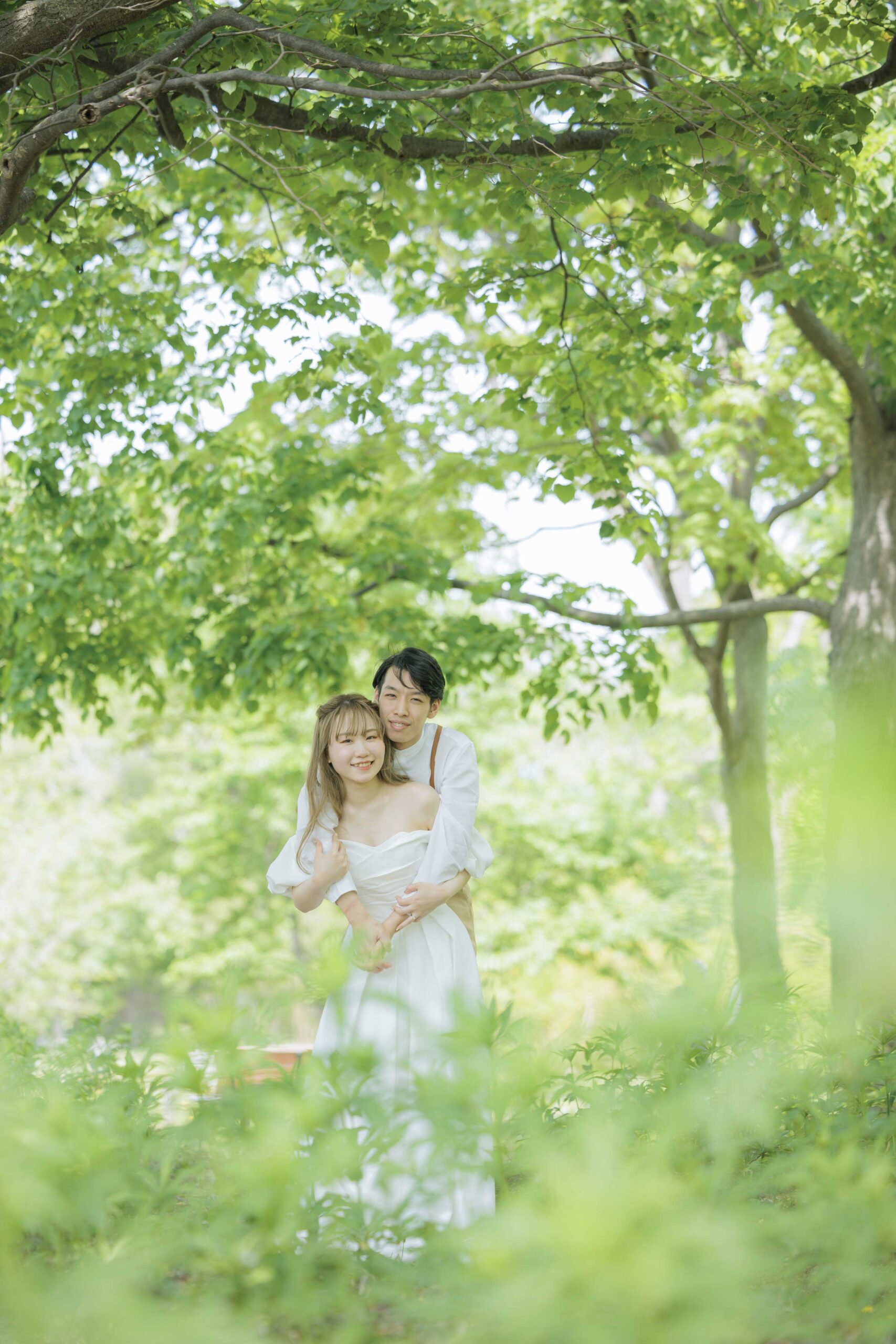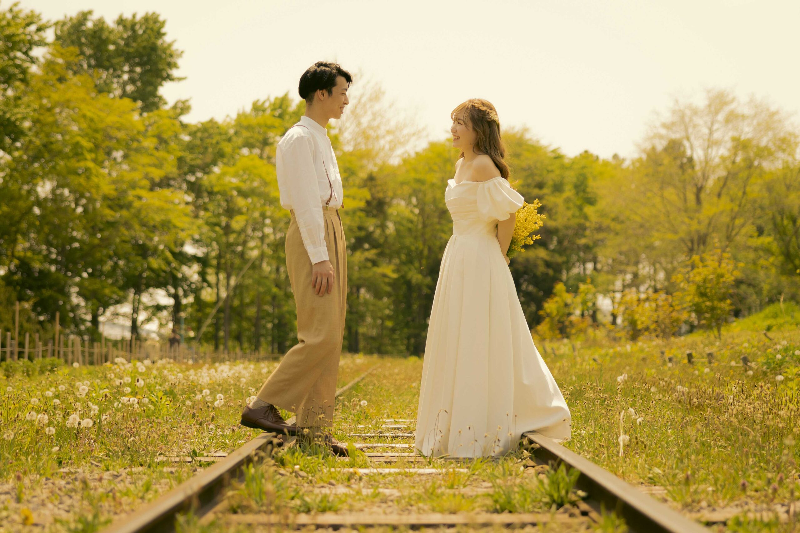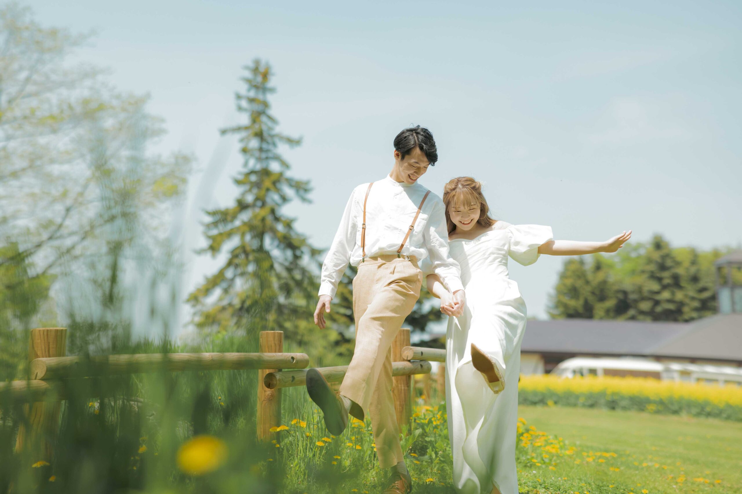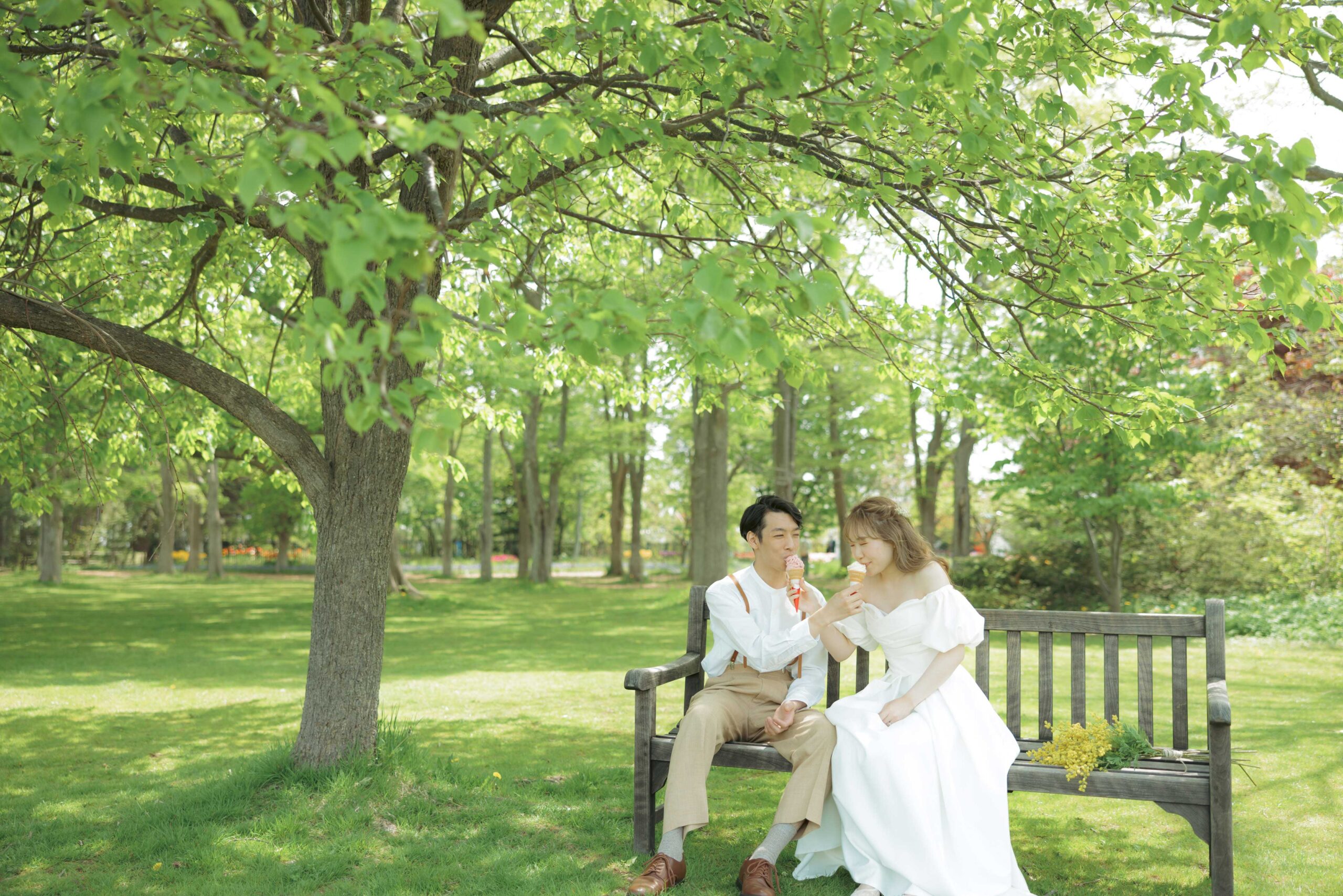 チューリップ、ムスカリなどパステルカラーの花の絨毯が広がる園内は、まるで夢のような世界。生命力に満ちた爽やかな新緑と明るい光の中で、幸福感溢れるお二人の笑顔を最大限に引き出します。北海道の待ち焦がれた春の喜びを、最高にロマンチックな一枚に残しましょう。