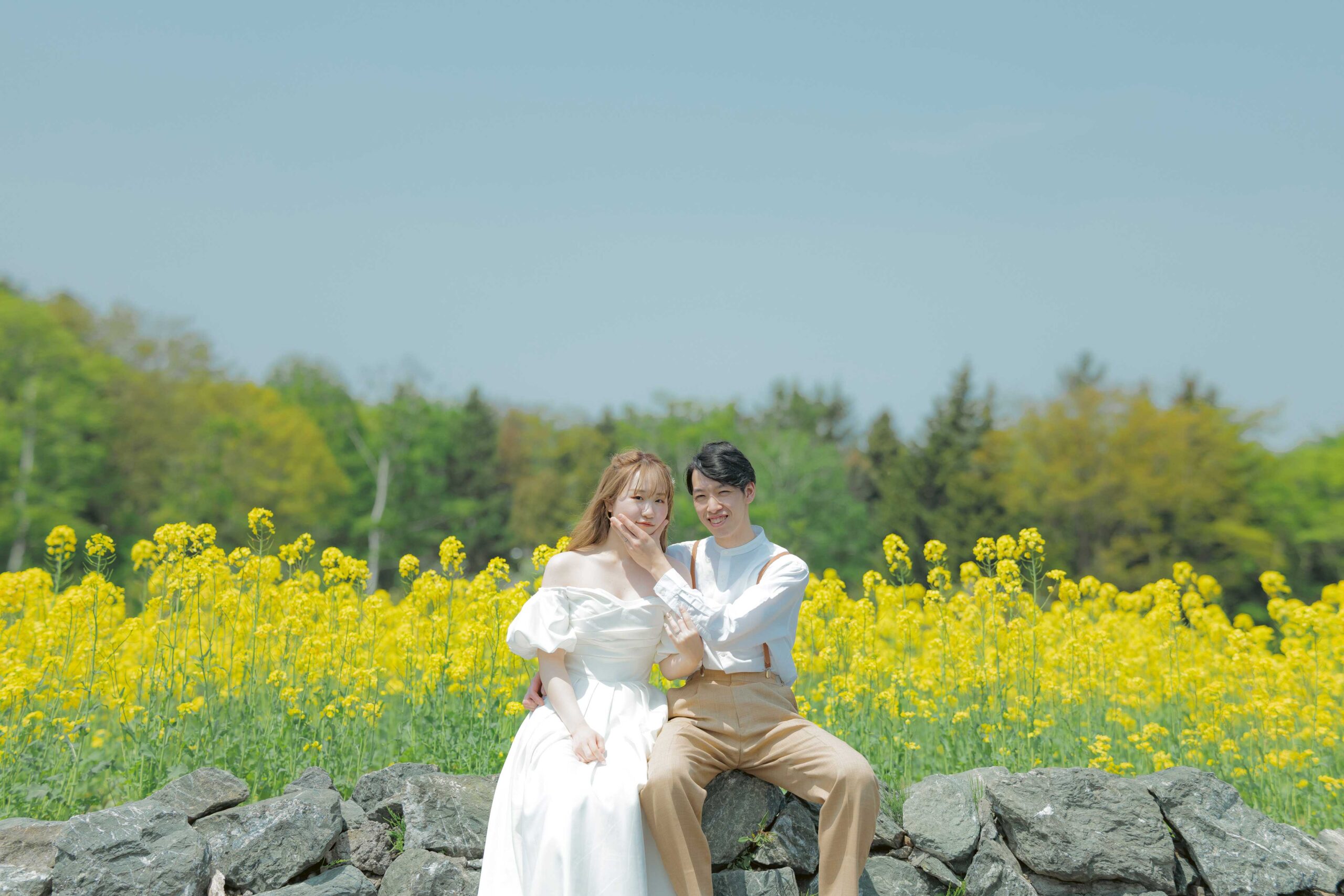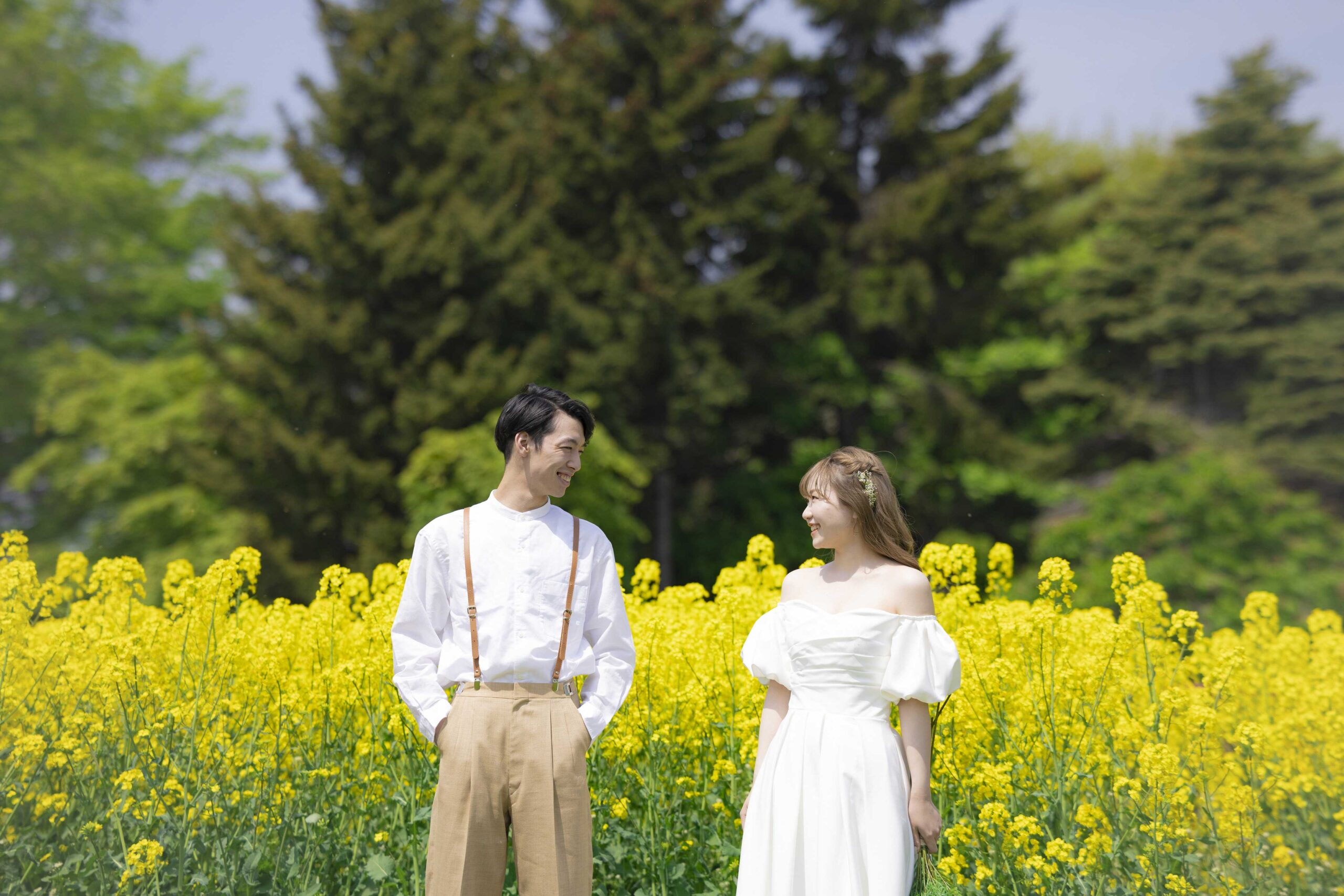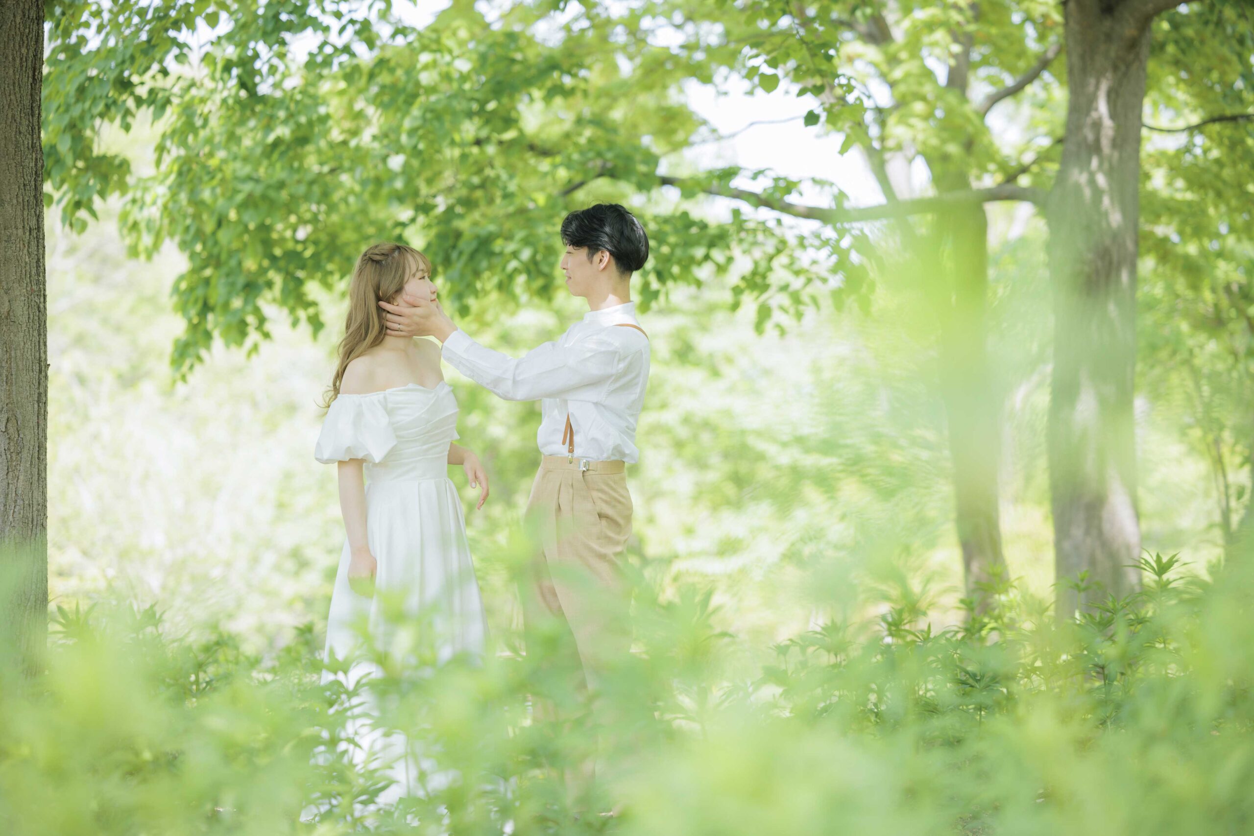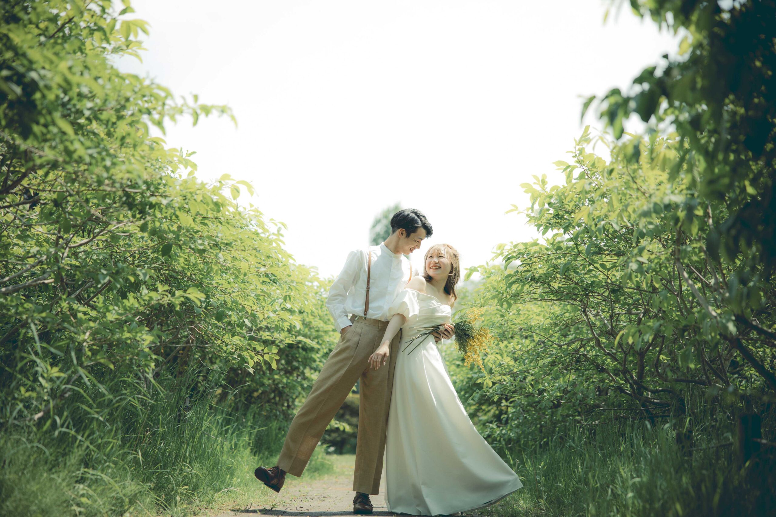 チューリップ、ムスカリなどパステルカラーの花の絨毯が広がる園内は、まるで夢のような世界。生命力に満ちた爽やかな新緑と明るい光の中で、幸福感溢れるお二人の笑顔を最大限に引き出します。北海道の待ち焦がれた春の喜びを、最高にロマンチックな一枚に残しましょう。