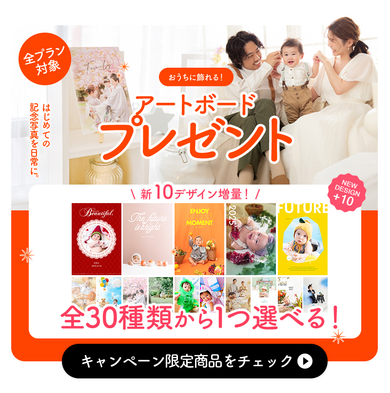 【ベビー / 七五三限定特典】はじめての記念写真を日常に。写真工房ぱれっと非売品商品『アートボード』をプレゼント!大好評につき、ベビー新デザインが10種類増量中!