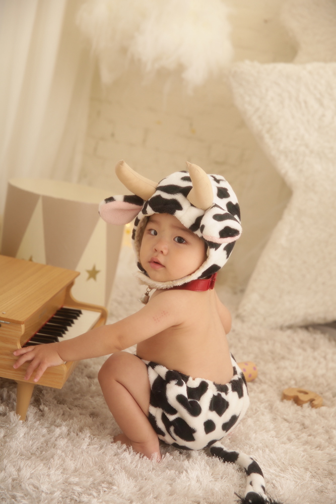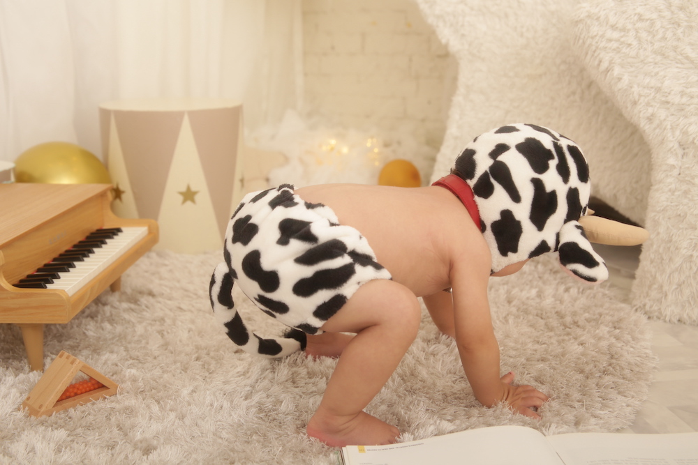 白を基調としたファンシーなセットと牛さんの格好が相性バッチリです…!