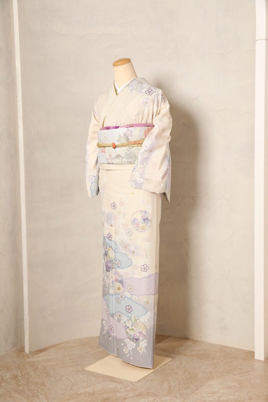▷淡い紫とピンクの掛け合わせが女性らしいお着物。