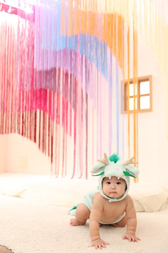 虹色のカーテンがカラフルでポップでかわいい!触って揺らしてみたりお子様ののいろんな表情を残すことができます♪