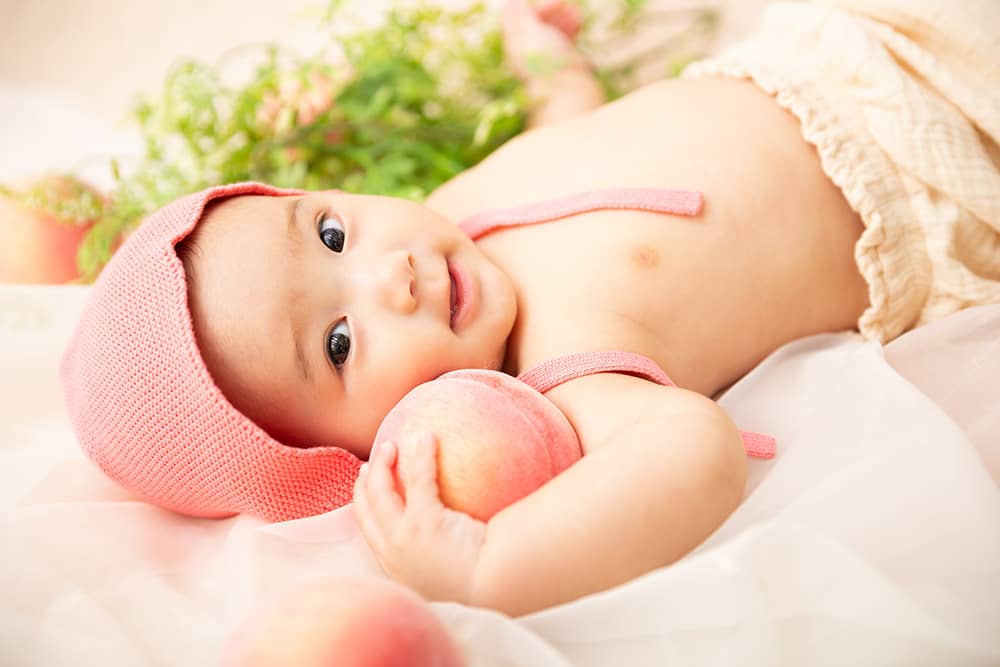 赤ちゃんのぷっくりしたほっぺはピーチそのもの!