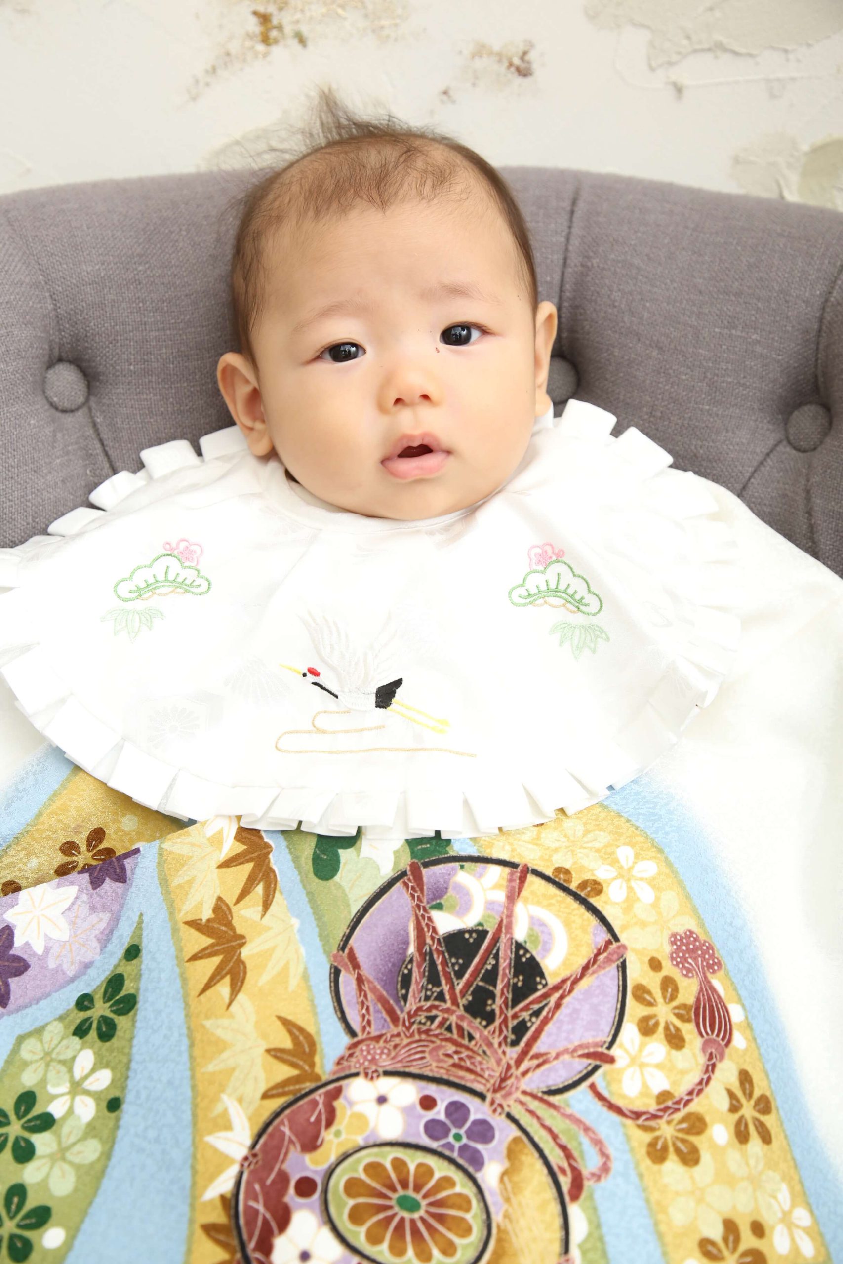 百日の着物は伝統的な衣装で、しっかりとした形で撮影します。