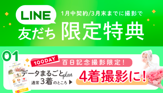 皆様こんにちは! 北海道札幌市にある写真工房ぱれっとサッポロファクトリー店です! 今回は当店のライン登録者限定の登録しておいて損はない特典についてご紹介いたします! 是非これから100日、1歳記念撮影を控えている方はチェックしてみてください!