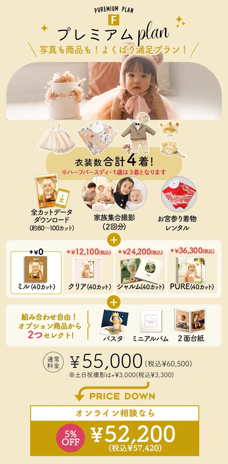 こちらのプランは、メインのアルバム1点の他にオプションアイテムから2点選ぶことができます。