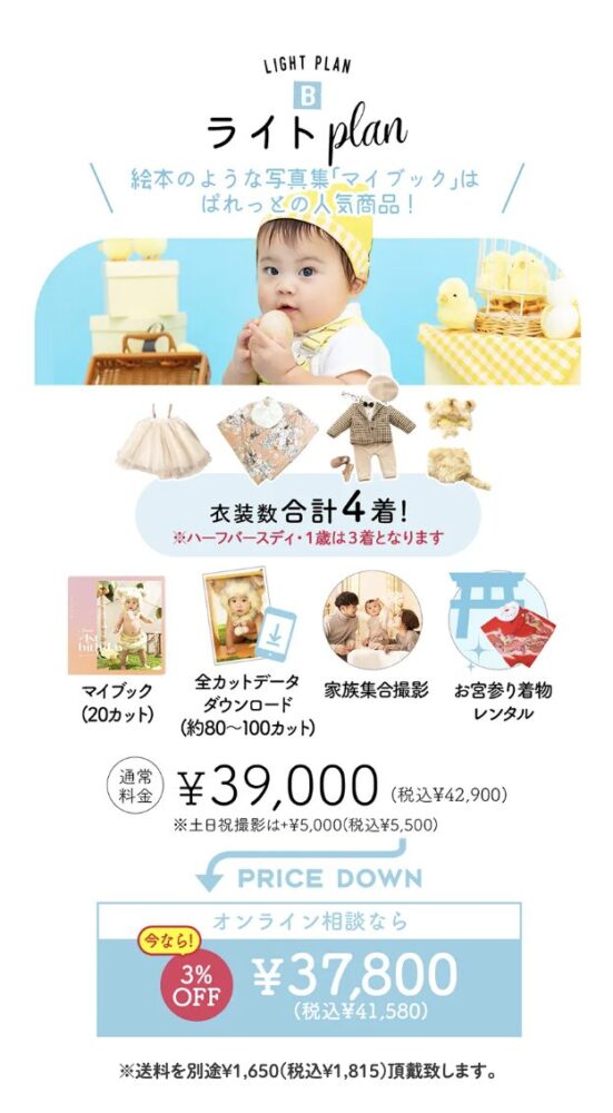 内容: 全カットデータ、絵本のような写真集「マイブック(20P)」、衣装4着、お宮参り着物レンタル