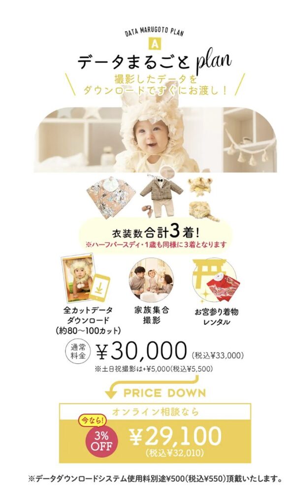 内容: 全カットデータダウンロード、衣装3着、家族集合撮影 ※データダウンロードシステム使用料として別途500円+税を頂戴します。