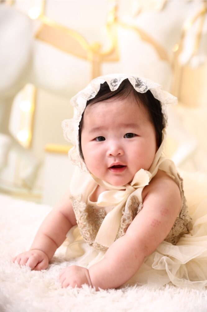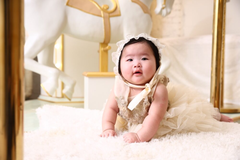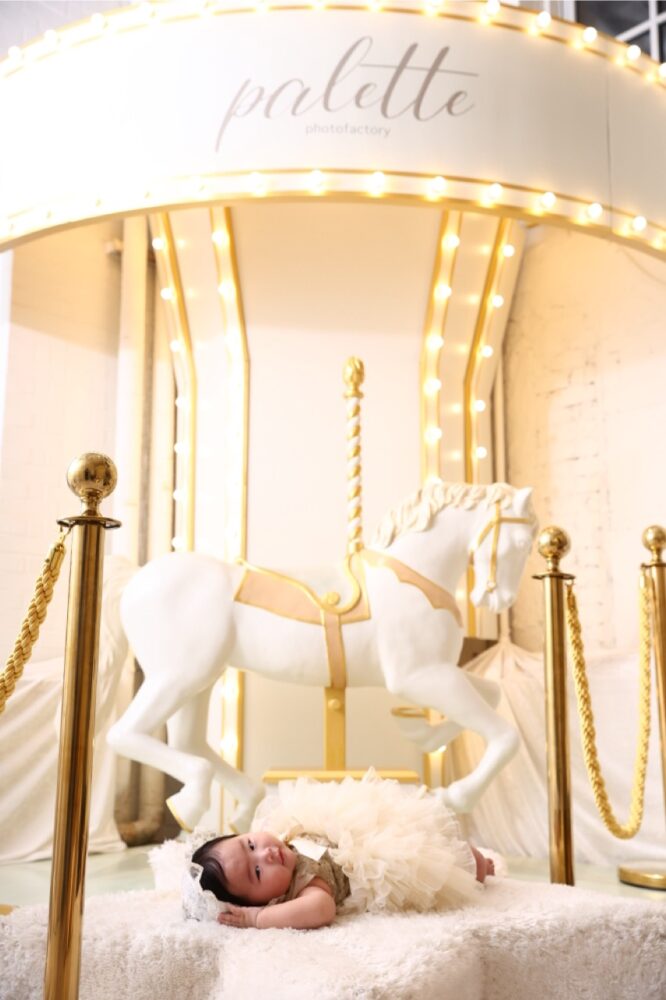 特に百日記念やハーフバースデーなど、まだお座りが安定しない時期でも、メリーゴーランドの装飾と組み合わせることで、奥行きのあるドラマチックな写真を残すことができます 。キラキラとした照明や、パステルカラーの背景は、赤ちゃん特有の透明感をより一層引き立ててくれますよ。