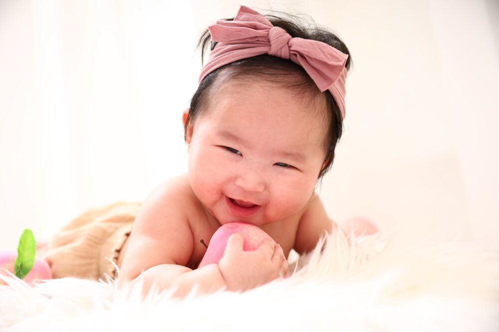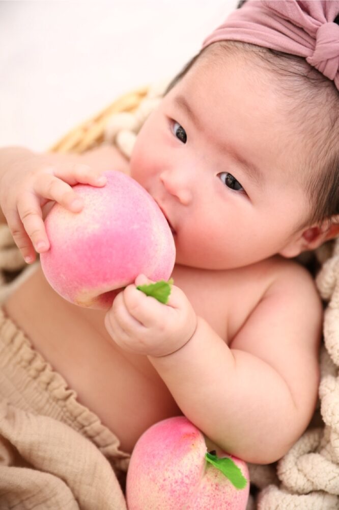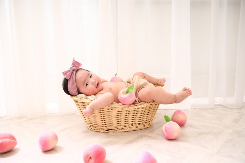 赤ちゃんの「むちむち」した可愛さを際立たせるのが、人気のフルーツコレクションです。中でも「もも」をテーマにしたスタイリングは、赤ちゃんの柔らかな肌の色とマッチして、見ているだけで癒やされるジューシーな写真になります。
