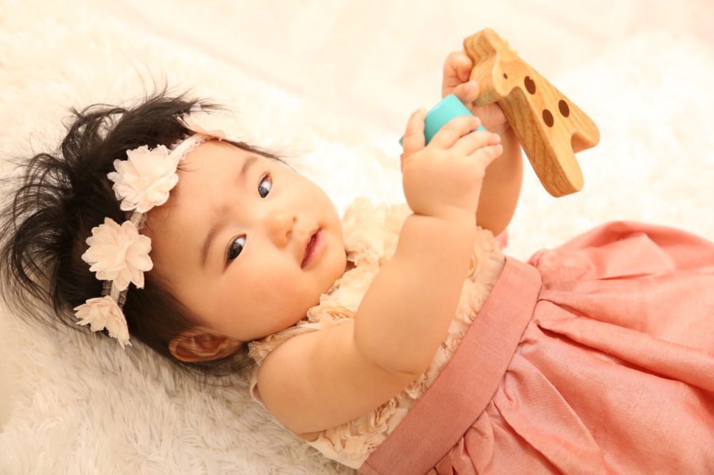 百日写真は赤ちゃんの機嫌がすべてです。スタッフは笑顔を引き出すプロなので、撮影がスムーズです。