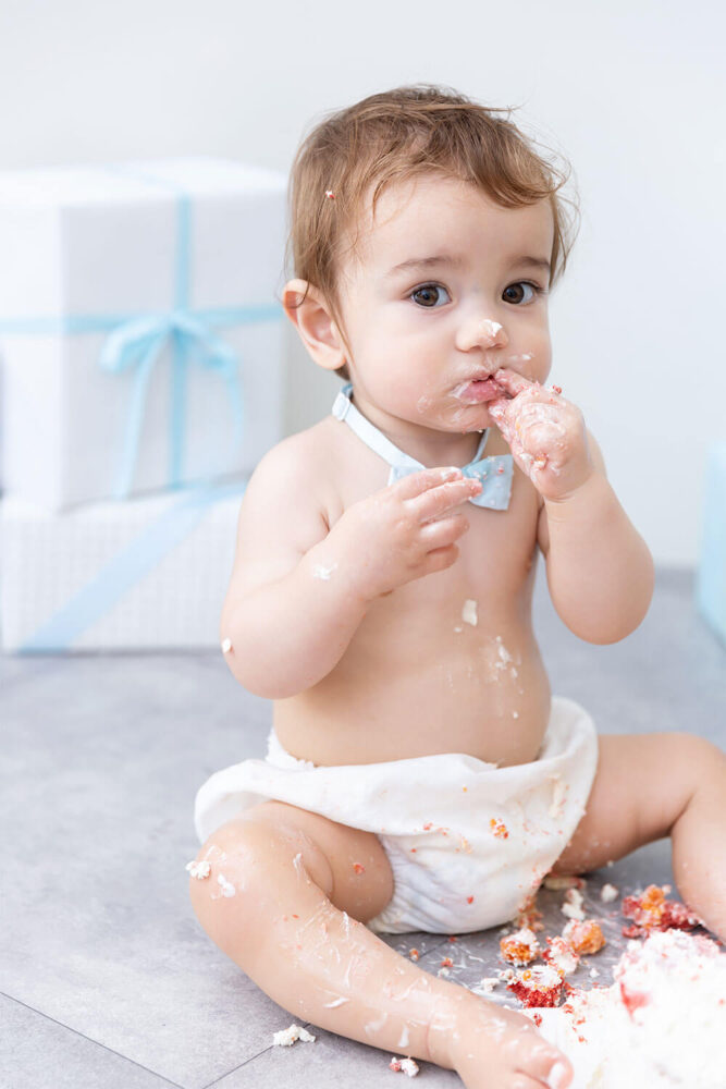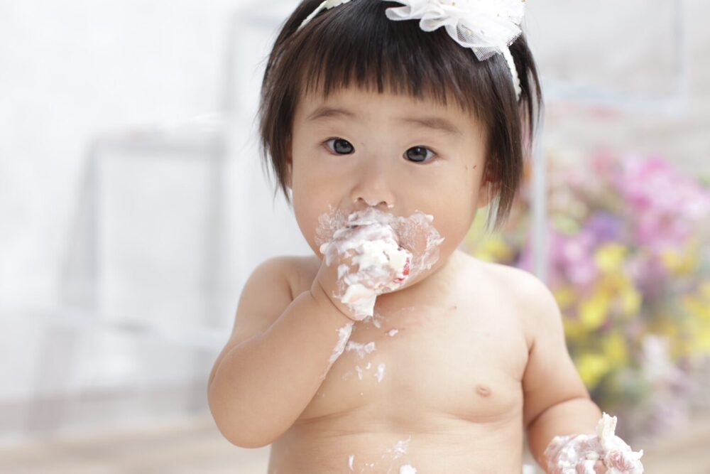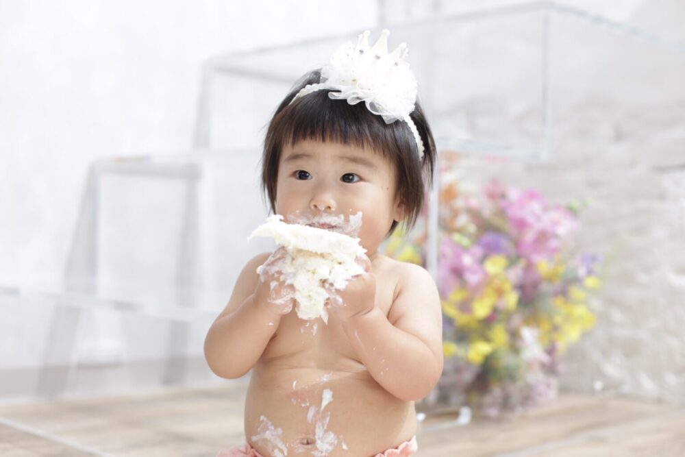1歳のお祝いとしてアメリカから広まった「スマッシュケーキ(Cake Smash)」。その名の通り、赤ちゃんに自由にケーキを「スマッシュ(壊す)」してもらい、手づかみで食べる様子を撮影するスタイルです。