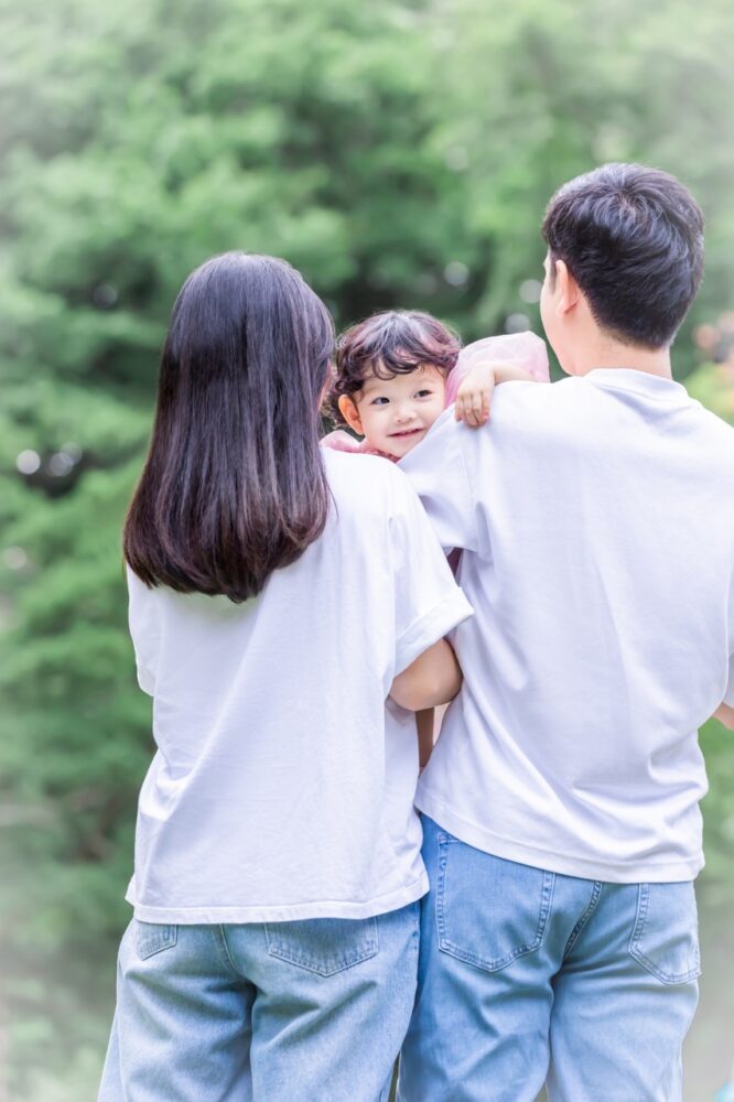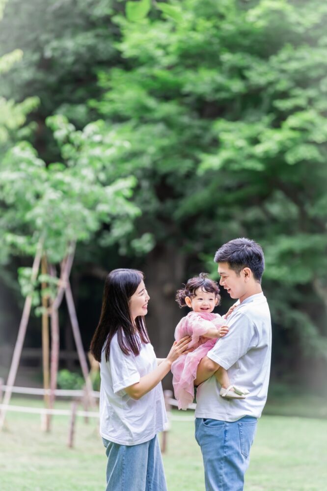 公園の奥行きを活かした構図で、まるで森の中に家族だけでいるような幻想的で穏やかな一枚ですね。