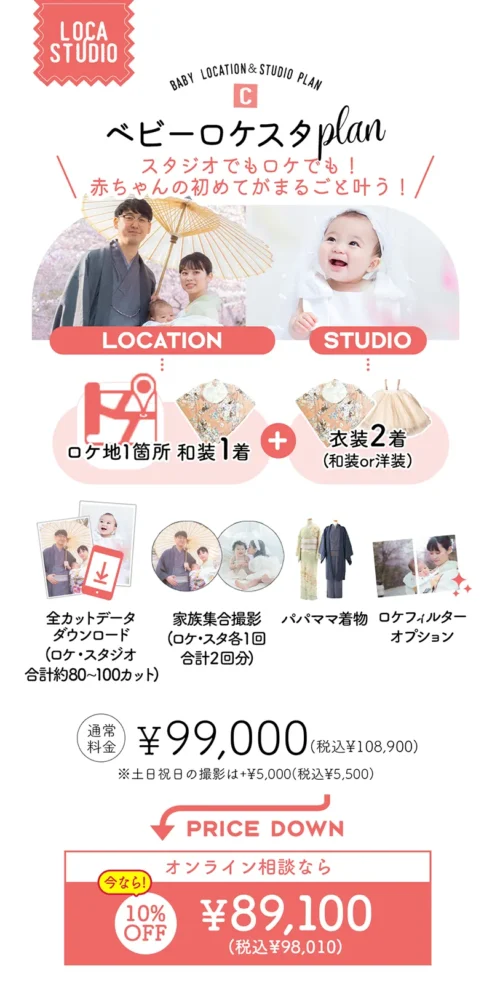 内容: 衣装ロケ1着スタジオ2着、全カットデータ(80〜100カット)、パパママ着物レンタル無料(通常¥60,500)、フィルターオプション無料、家族集合撮影2パターン(ロケ・スタジオ)