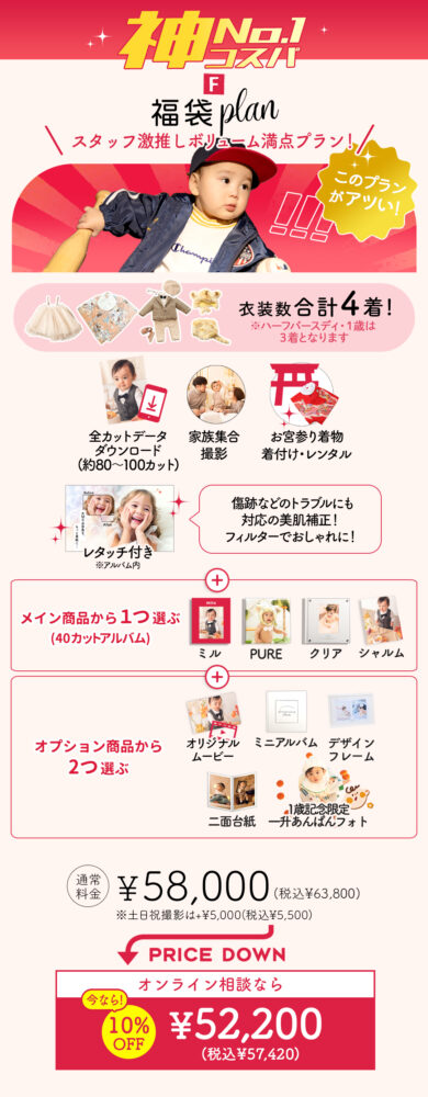 100日も、一才のお誕生日も¥30,000(税込¥33,000)からご案内! こだわりのスタイリングや撮影をリーズナブルに叶えることができます。 札幌の中央区の2店舗(サッポロファクトリー、札幌大通)、帯広、旭川、函館に各1店舗と主要部に店舗展開。北海道を拠点に全ての「記念」が、史上最高になるよう精一杯お手伝いをさせていただきます。 費用は抑えたいけどガマンもしたくない!そんなパパママの皆様へ。様々なプランをご用意しているので、 着ぐるみ2着や、カジュアル&和装など組み合わせも自由自在。 写真工房ぱれっとだからこそ提供できる、おしゃれで可愛い♡お衣装をご用意しております。 どんなご撮影がいいのか、どんな衣装がいいのか、どんな場所がいいのか。イメージが固まっていなくても大丈夫です!お気軽にご相談ください。 各店舗100着以上、全店舗合わせると500着以上の衣装の中から運命の1着に出会える! ご試着は全て無料です。 衣装は全てwebに掲載中!目星をつけて、ぜひご来店して試着してみるのをお勧めしております。 ①普段使うアプリで!LINE登録 ②お急ぎの方は!お電話 ③24時間対応可能!web予約&オンライン相談 お好きな方法でコンタクトをお取りください★ ・どんな衣装があるか知りたい ・我が子に似合う衣装を提案してもらいたい ・お得なキャンペーンを知りたい ・どんな準備をしたら良いのか教えてほしい などなど、どんな些細なお問合せでも構いません!気になることはなんでもお気軽にお問合せください。 気になる店舗をLINE登録! 期間限定のキャンペーンの配信もあるのでお見逃しなく。 店舗のスタッフがお答え致します! ◆写真工房ぱれっと サッポロファクトリー店 ◆写真工房ぱれっと 札幌大通店 ◆写真工房ぱれっと 旭川店 ◆写真工房ぱれっと 帯広店 ◆写真工房ぱれっと 函館北斗店 ◆palette +plus 西岡店 ◆palette +plus 西店 ◆palette +plus 東店 24時間対応可能!web予約フォームが便利です。 Instagramでは最新ビジュアルやキャンペーン情報を発信中です💫 フォローしてチェックしてくださいね♡ 写真工房ぱれっとは、大切なお子様の一生の思い出として、人生がより豊かになるような体験と写真をお届けできるよう、全力でお力添えさせていただきます。 初めてのご記念、ぜひ写真工房ぱれっとにお任せください。 100日記念・一歳お誕生日撮影は写真工房ぱれっと