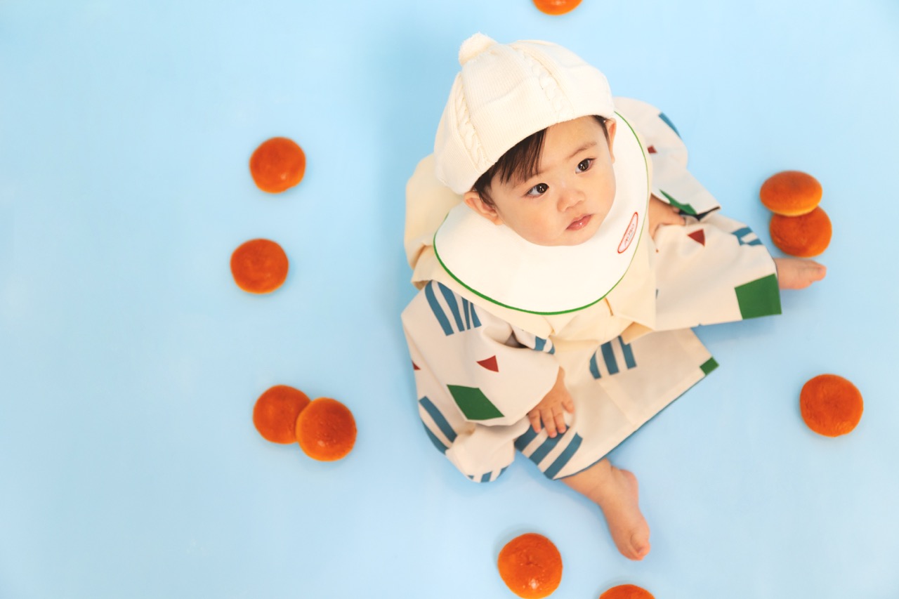 スタジオの柔らかな光の中で、コロンと丸いあんぱんに囲まれる赤ちゃんの姿は、