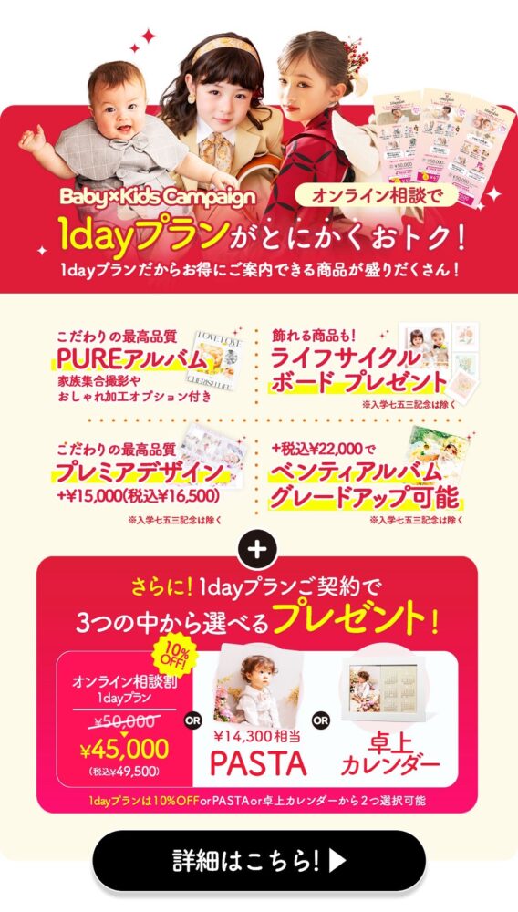 こんにちは、サッポロファクトリー店です! 写真工房ぱれっとでは、ベビー&キッズの記念撮影をお得に楽しんでいただけるよう、特別な撮影プランをご用意しています。 1day プラン で、最高級アルバム付きの豪華1日撮影はいかがですか?