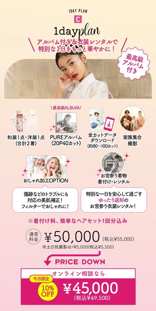 1dayプランには「お宮参り着物レンタル」が付いています。特別な1日をゆったり過ごして翌日の返却が可能です👍